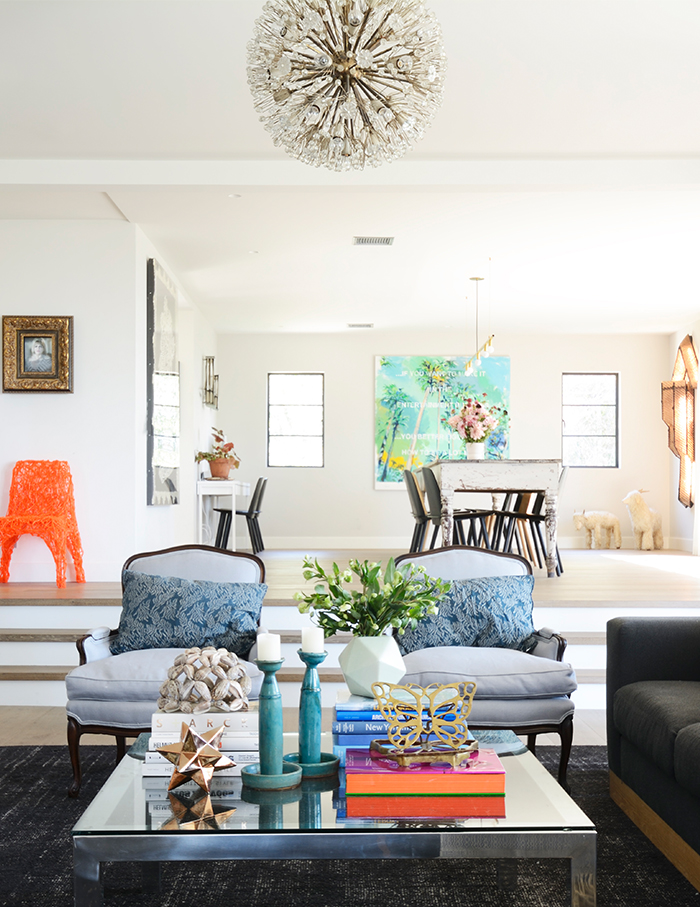 The focal points of transition between the living and dining areas are an orange-hued Tom Dixon chair and a wall-mounted painting by David Kramer; Photographs courtesy The Novogratz