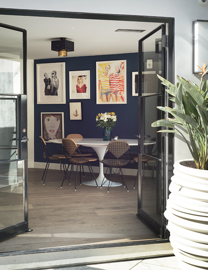 Flanked by artworks and photographs, the kitchen setting is spruced with a table and chairs by Eames Demetrios; Photographs courtesy The Novogratz