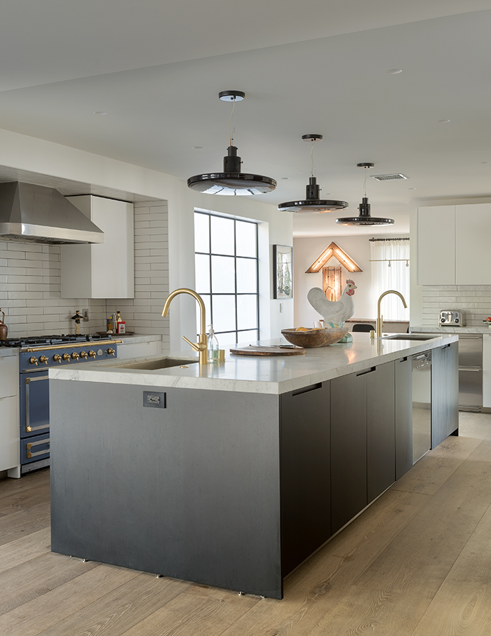 The result of The Novogratz’s intervention is that of a renovated home that accommodates a colossal, bi-level, fluid living and dining area, a spacious luxury kitchen wrapped around a marble topped island, and an adjoining breakfast room that extends onto the backyard through chic, steel-trimmed French doors.
