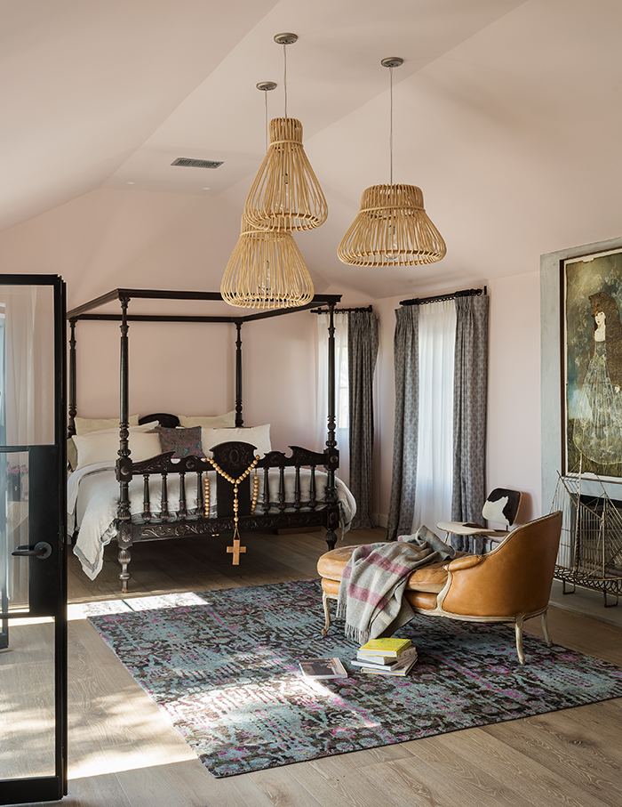 A trio of bespoke pendant lights custom made by The Novogratz illuminates this cosy boudoir; Photographs courtesy The Novogratz