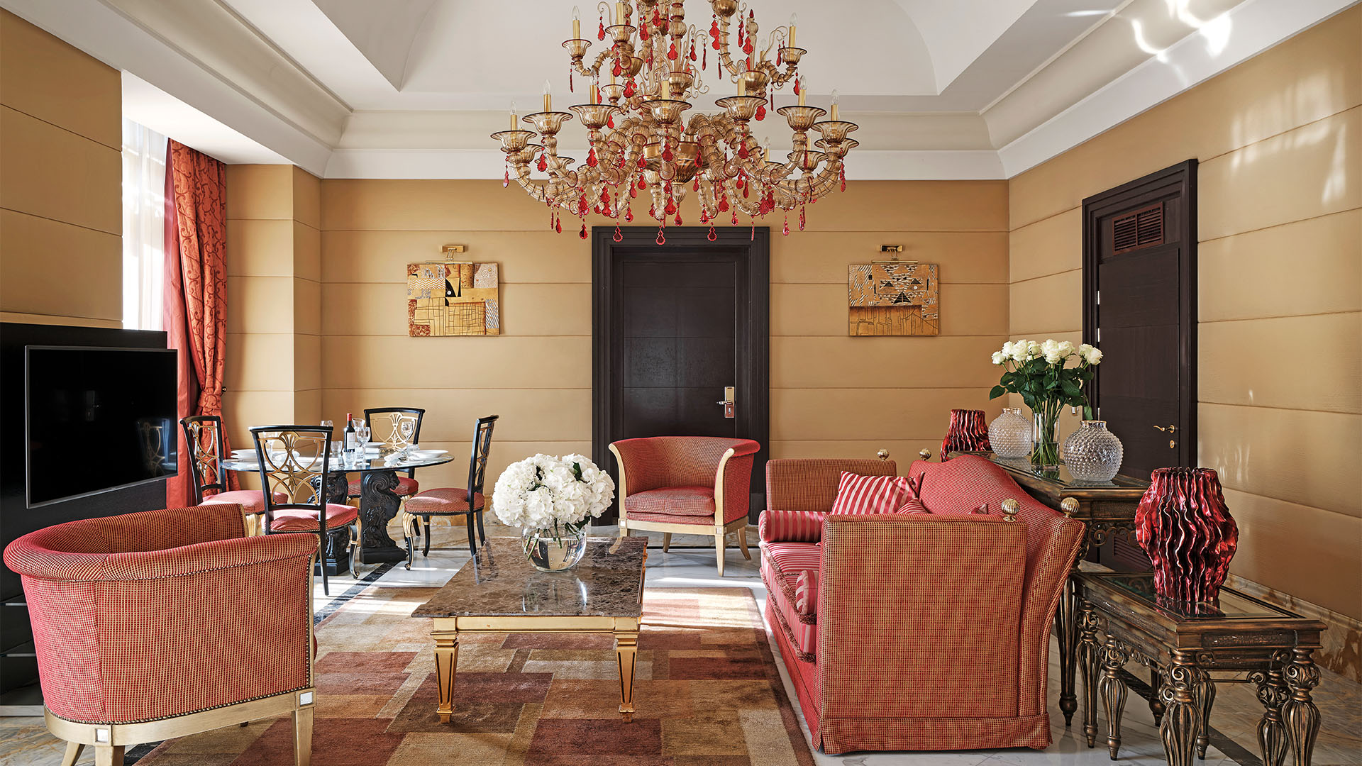 A long barrel-vaulted salon groups dining, lounging and media zones, with an amber-red Murano-style chandelier above its marble floors; Photographs courtesy Anantara New York Palace Budapest Hotel
