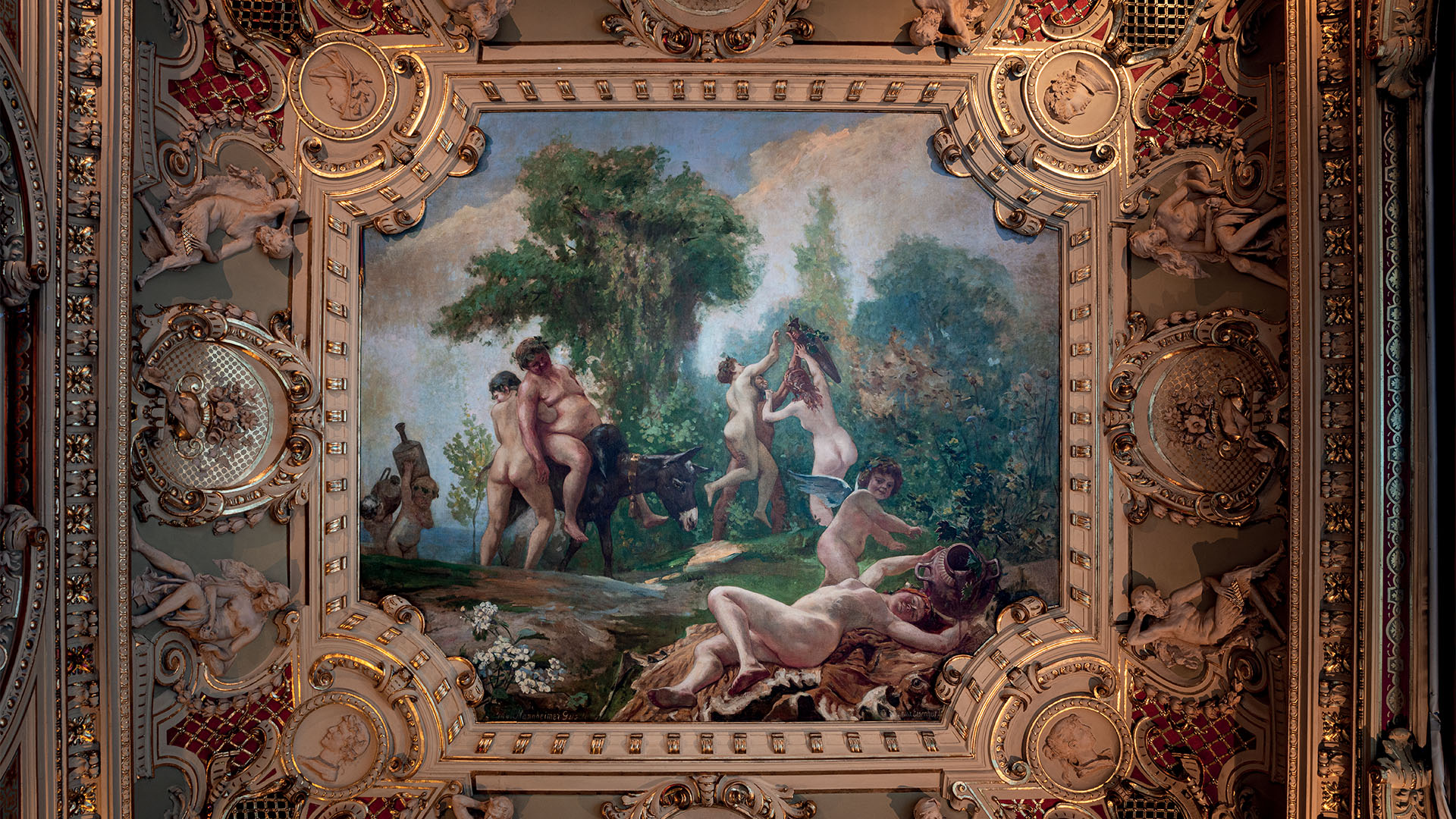 Ceiling fresco in the Deep Water breakfast room with mythological figures framed by gilt stuccowork, cartouches and red-latticed panels; Photographs courtesy Anantara New York Palace Budapest Hotel