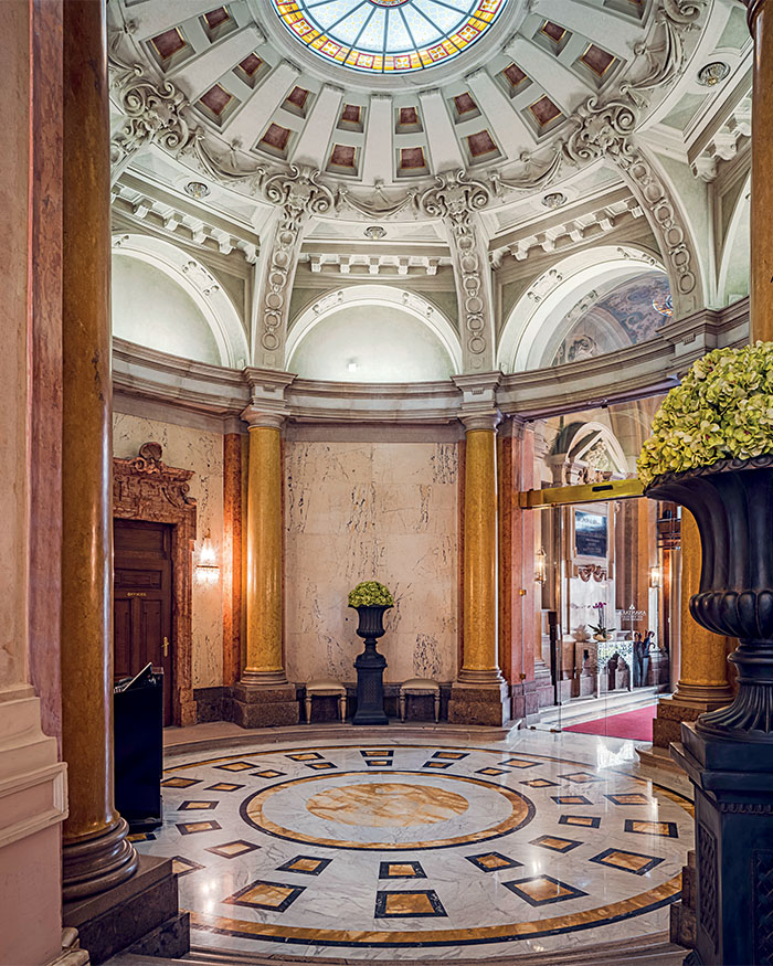 A domed vestibule inside sets the tone for arrival, with its coffered ceiling, stained-glass oculus, marble floor and gilt columns; Photographs courtesy Anantara New York Palace Budapest Hotel
