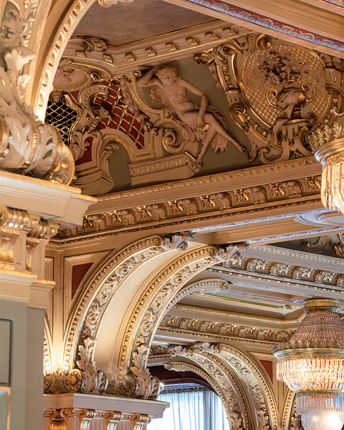 Ceiling fresco in the Deep Water breakfast room with mythological figures framed by gilt stuccowork, cartouches and red-latticed panels; Photographs courtesy Anantara New York Palace Budapest Hotel