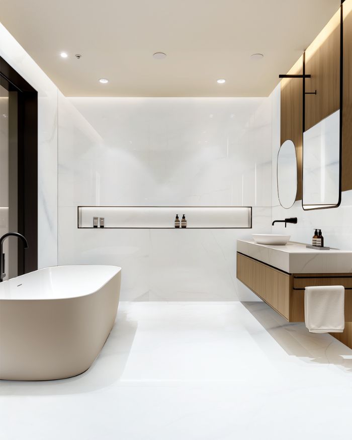 Angelo White marble embodies Mies van der Rohe’s ‘less is more’ principle that resonates profoundly in contemporary design. The stone’s reflective property amplifies openness, ensuring even the most compact spaces feel extensive. This makes it a perfect choice for simple, uncluttered interiors, where each element serves a purpose without crowding the design.