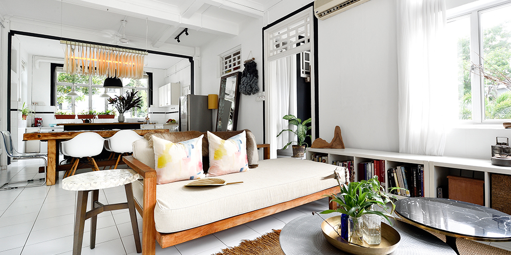 A quaint essence engulfs the apartment as we traverse through its entrance passageway. While a splash of greens add positive aura to the pristine backdrop, wooden decor pieces such as the corner tables and especially an Indian arched door with a mirror render a vintage narrative. Setting in line with the black and white theme of the house (inspired by the colonial locality), a matte finished black border frames the entry to the living room.