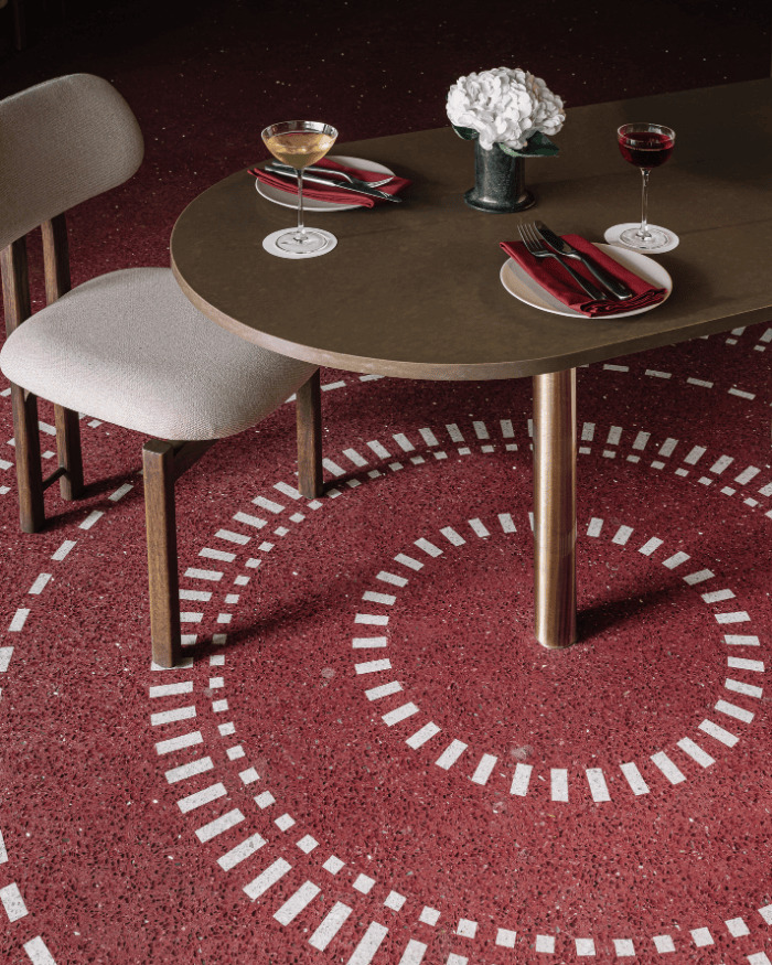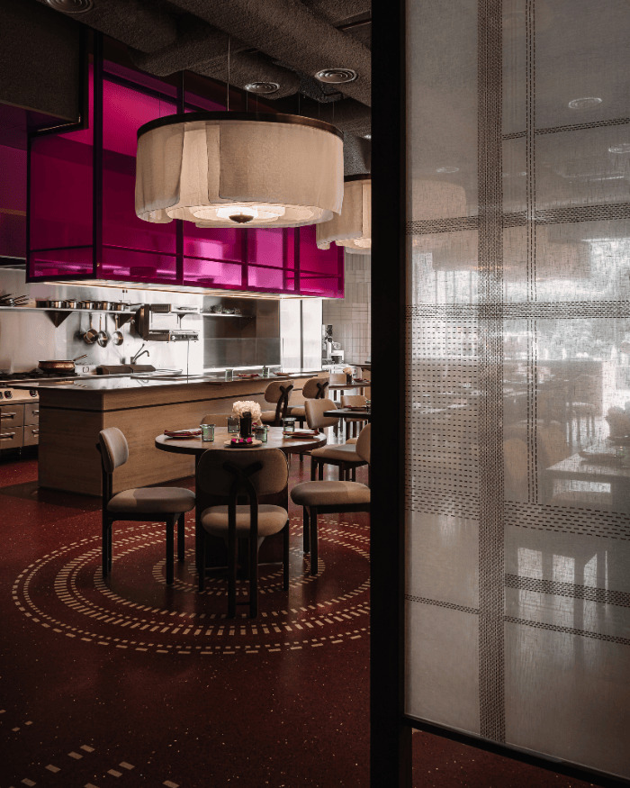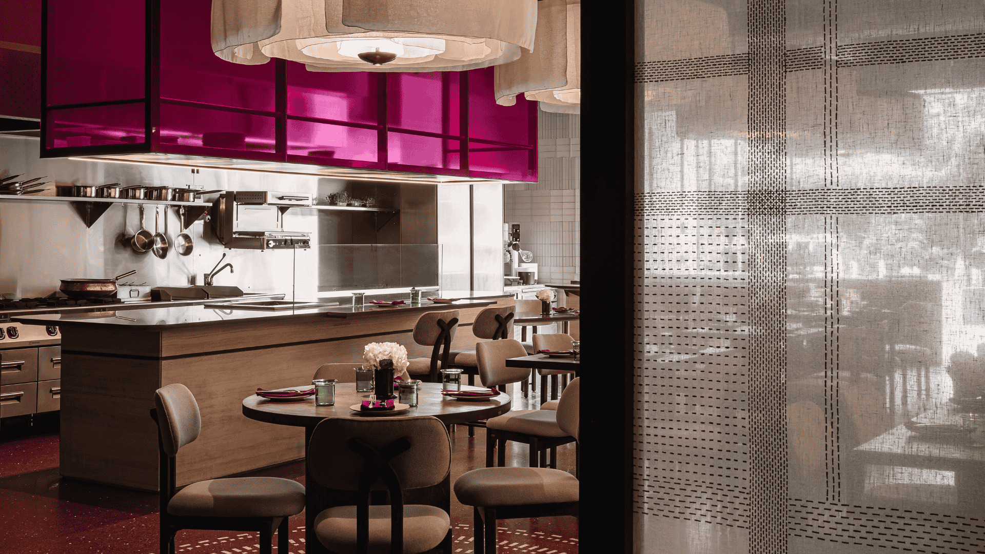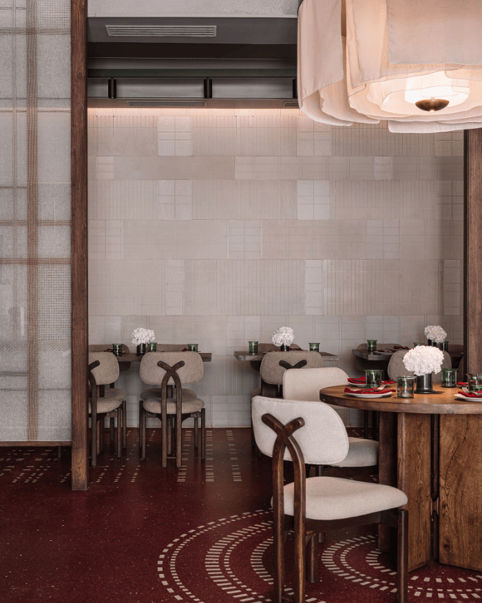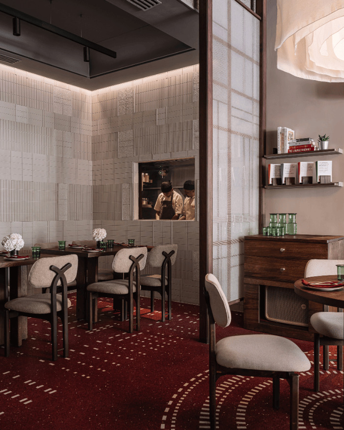 Indian ideas of craftsmanship are etched in many details, inviting guests to slow down and breathe in the beauty of age-old artistry. Materials like Indian teak stone and Gwalior mint sandstone on the walls reminds one of their roots, while outlining an array of textures. A glass panel that separates the communal dining area holds a translucent fabric that illustrates a contemporary take on traditional kantha. The same pattern finds itself in the white terrazzo inlays of the flooring.