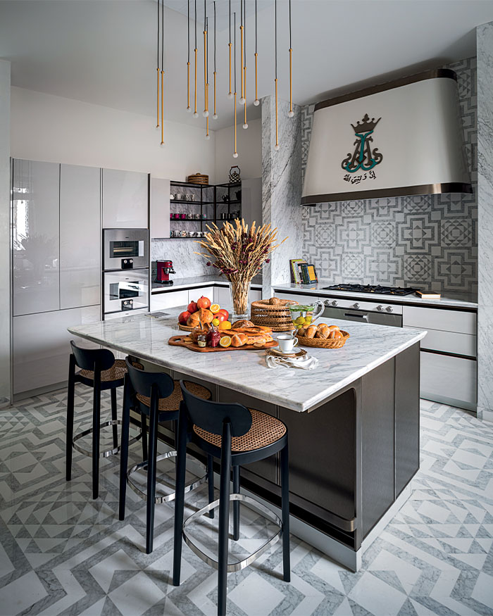 In the SieMatic kitchen, the range hood carries Anjum’s coat of arms. Suspended above the Island counter is Storm from Penta Light and the flooring is in marble with an inlay pattern; Photograph by Fabien Charuau