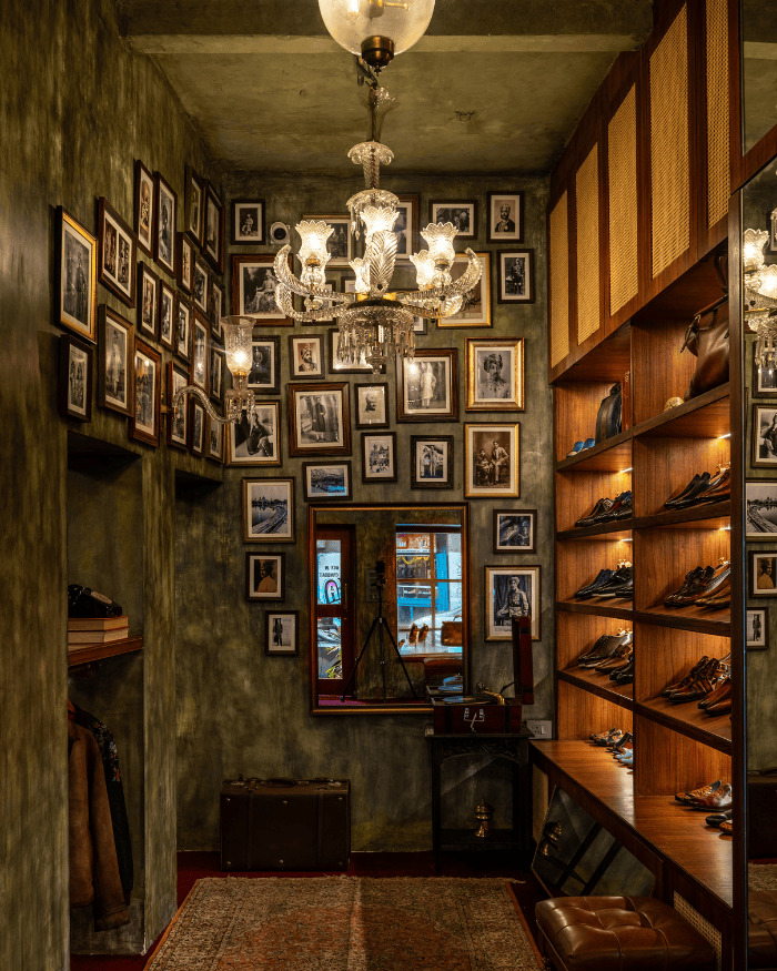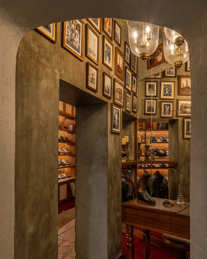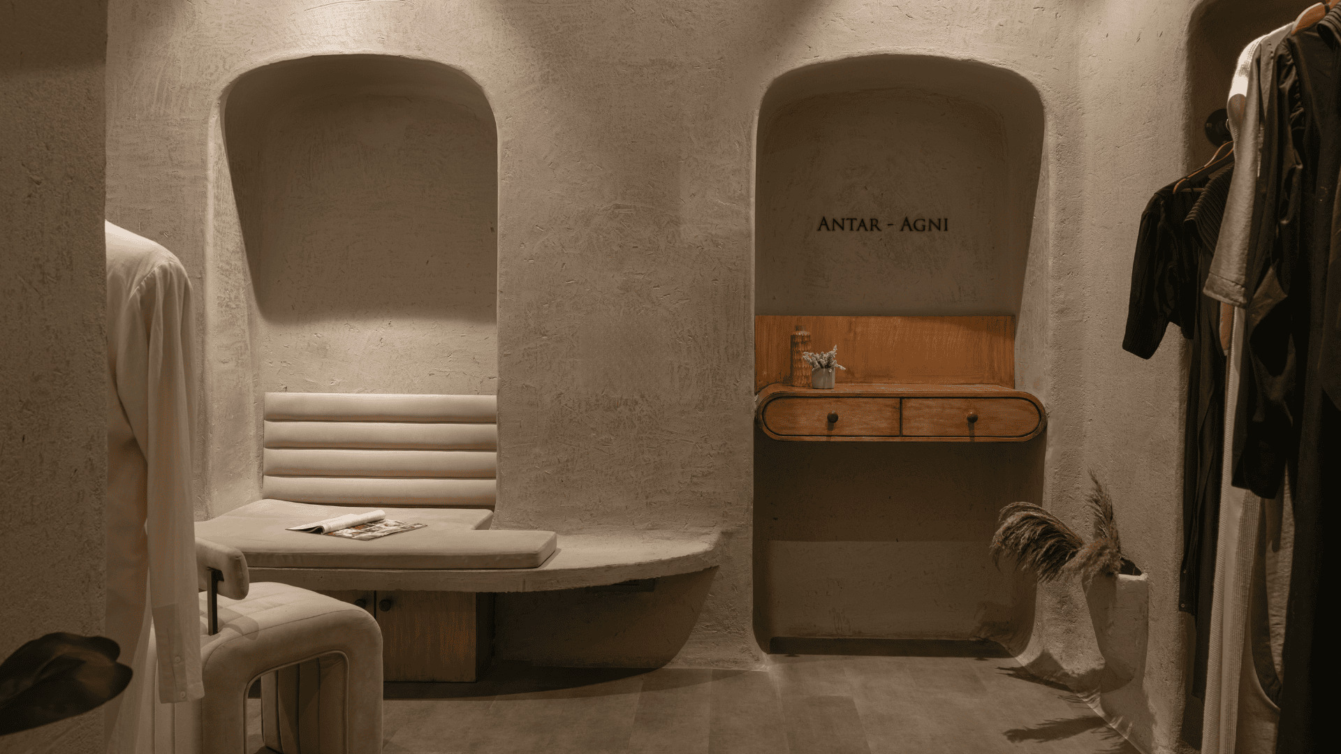 Nestled in Kolkata, the venue’s 878 sq ft area encompasses the two brands, delving into a play of visual transitions. While Antar Agni’s space, helmed by Ujjawal Dubey, reflects a futuristic, warm tonality; Toramally led by Rahul Shastri embraces a nostalgic colonial-style essence, enhanced by layered carpets. “The store is housed in an old building with thick walls. We had to be extremely careful while carving out new openings to ensure the structural integrity remained intact,” reveals Anumeha Todi, Principal Designer at Studio Absorb.