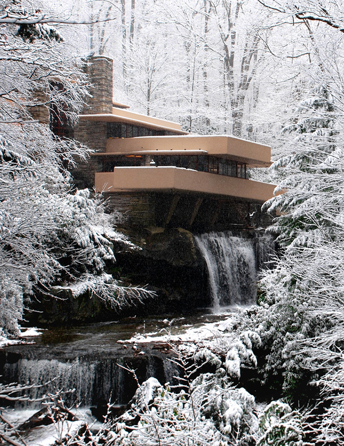 Deriving its name from the waterfall it’s partly built upon, Fallingwater was designed as a weekend home in 1939. Set amidst the mountains of Southwestern Pennsylvania, the project the architect’s one the most celebrated works exemplifying his philosophy of organic architecture: the harmonious union of art and nature. The staggered built form of the buildings transforms and blends into the snow covered landscape of the mountains.