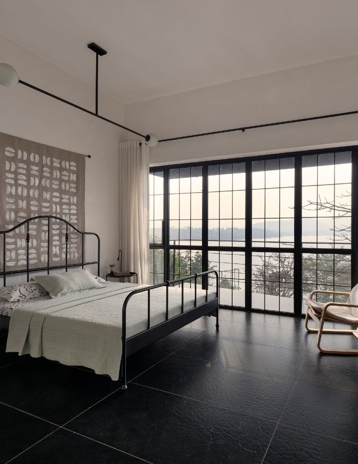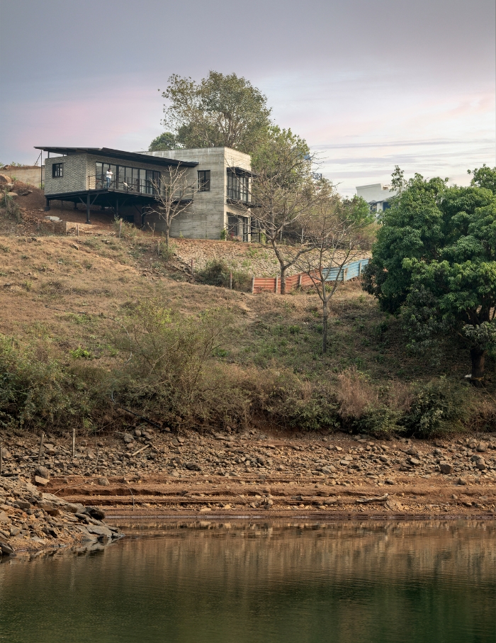 The entrance opens into a lobby with a skylight at the centre of the house, which bathes the stairwell in sunlight. “The central mass has a slight tilt in plan, which not only opens up the views of the living room towards the lake, but also aligns the bedroom towards the setting sun,” Ankur enthuses. The home sees use of fly-ash brick walls and basalt stones.