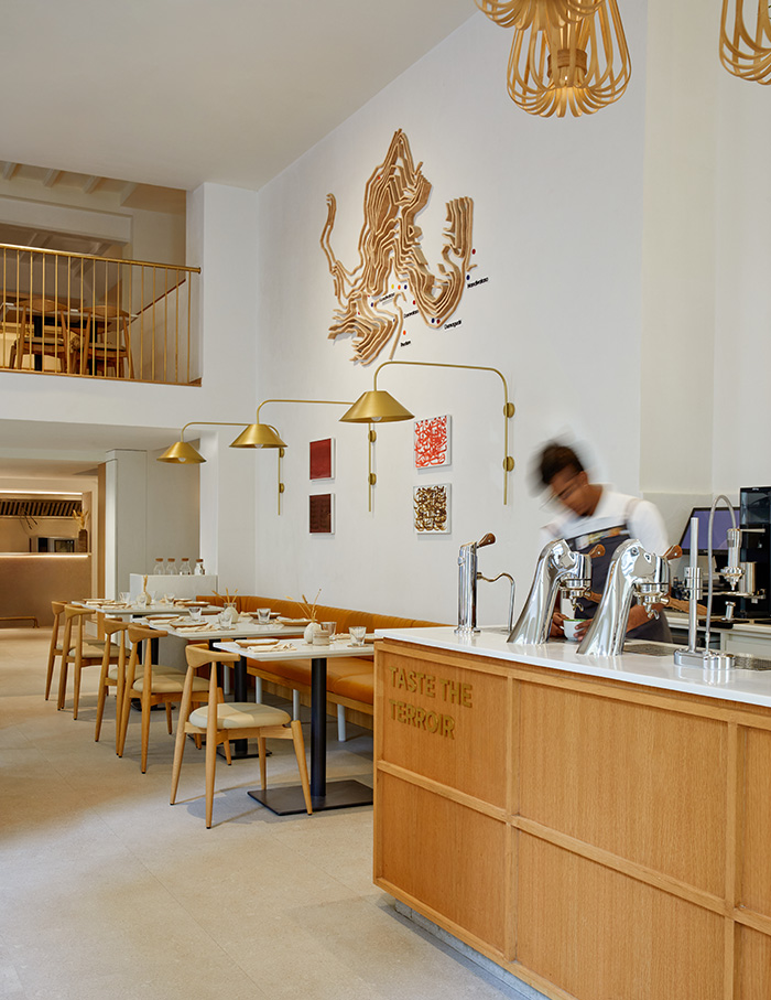 Verandahs made using natural stone in varied textures form seating zones, private workspaces, reading nooks and a dining pavilion. The home is dotted with transitional spaces that feature inbuilt seats finished in pigmented cement, encouraging a restful pace. In the living room, a staircase with a reclaimed canary yellow railing leads to the private quarters on the upper level.