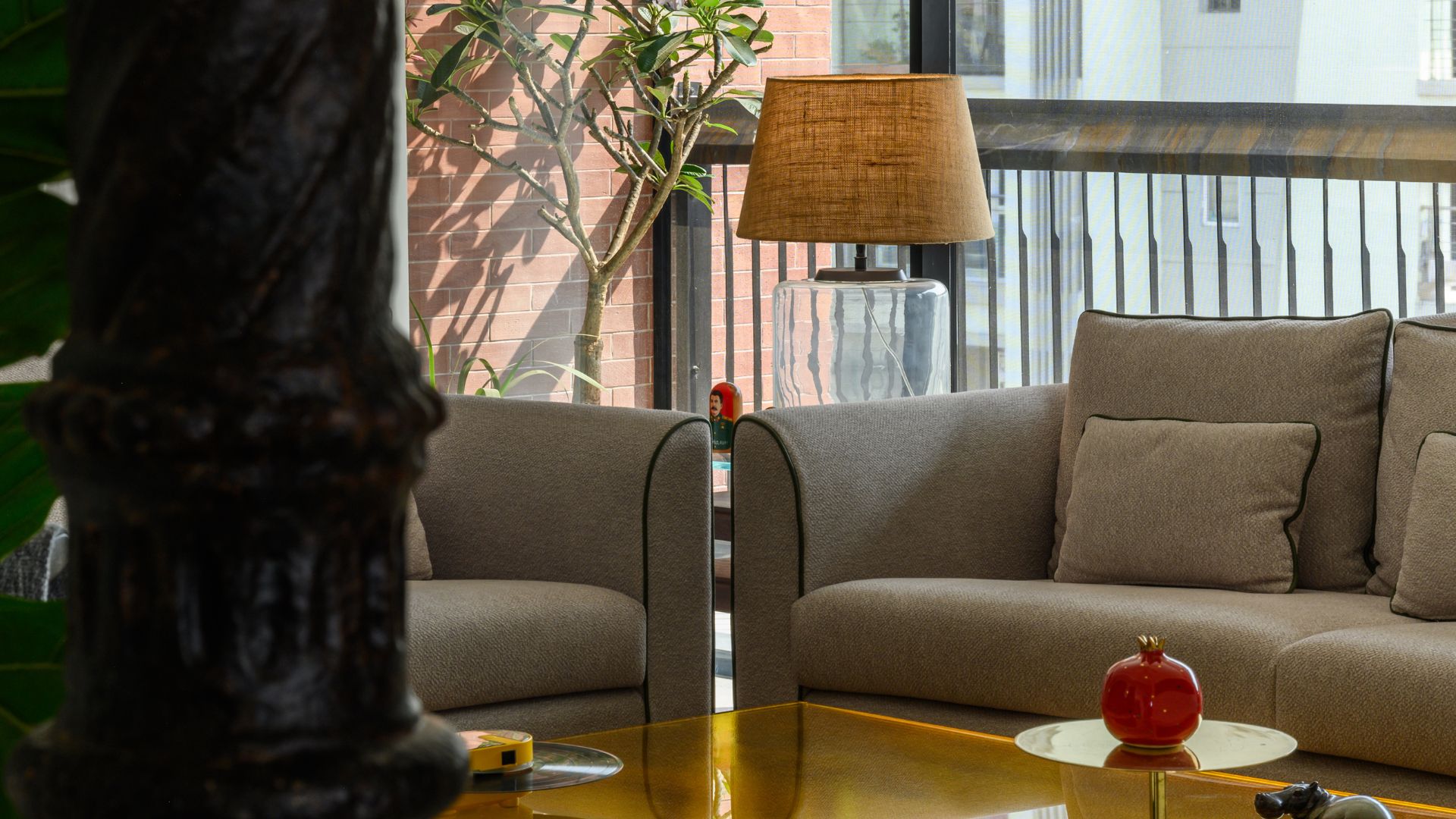 The home opens with a chequered foyer and ornate doorways that immediately establish a neoclassical tone. As one moves into the living room, the palette softens into warm neutrals, allowing furniture and objects to introduce moments of colour. A mango-yellow glass table punctuates the space, while a Parisian-style nook by the balcony relaxes the formality of the primary seating.