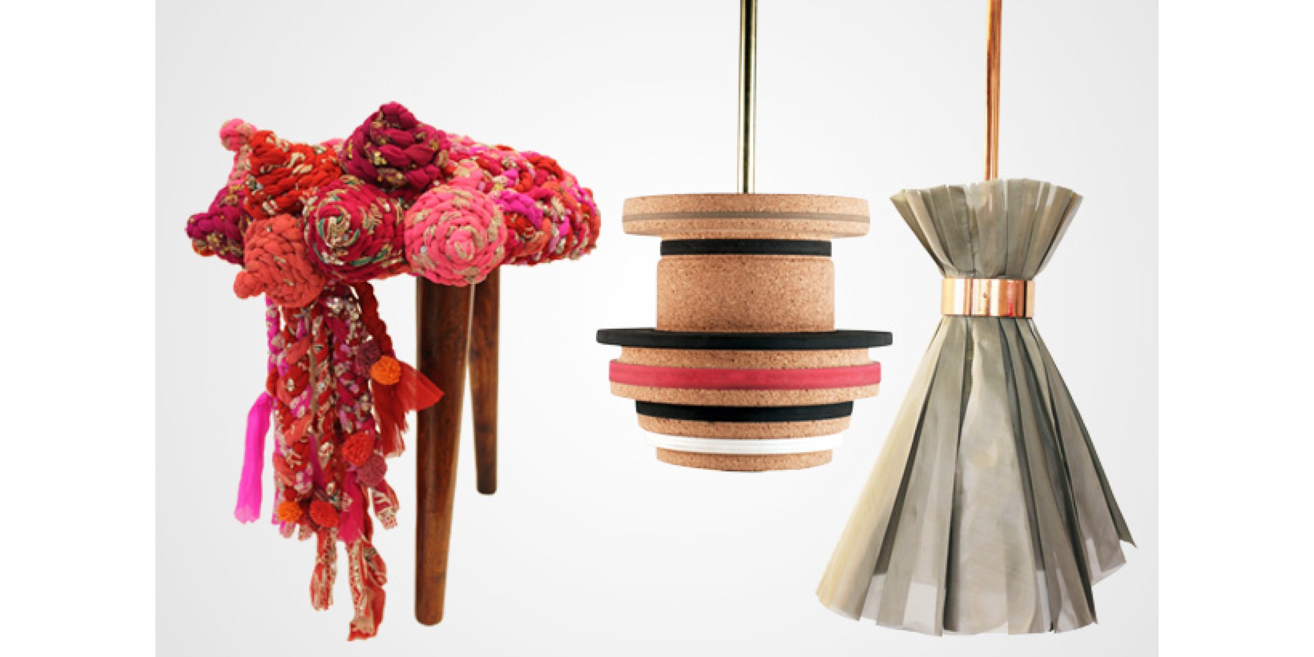 Showcasing at Salone del Mobile 2015 “I displayed the Champki Totem series of upcycled furniture made using old spangled saris that are braided to resemble a chotli or jooda. The Grace lights take after ancient Grecian attire using steel wire mesh, while Samsara Cosmic illuminators explore Memphis movement shapes reinvented using cork, rubber, copper and brass.”