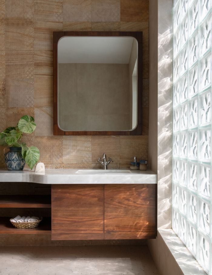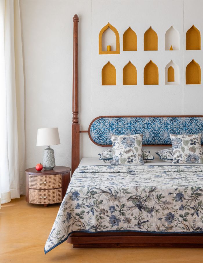 The master bedroom, a blend of classic and contemporary design, features flooring in yellow Jaisalmer stone with traditional niches complementing the same yellow shade carved out of the wall. Natural light flows into the spa-inspired master bathroom through glass blocks, enhancing its calming ambiance.