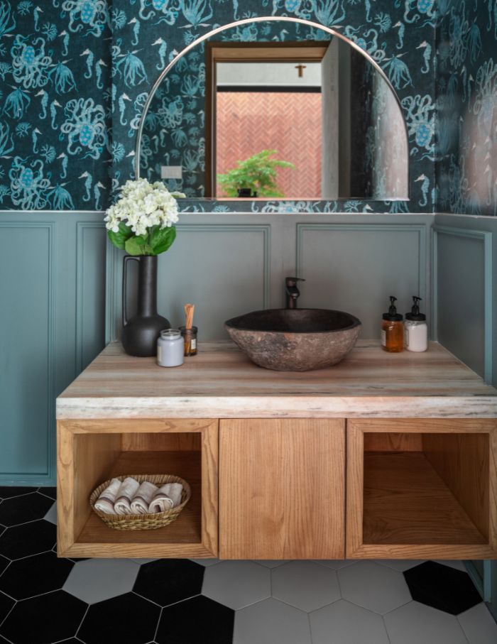 The powder bathroom features a dramatic and playful shift from the overall language of the home with a stunning marine-inspired wallpaper on top of a solid aqua-blue coloured dado. The hexagonal black and white tiled flooring compliments the extravagant theme of the space.