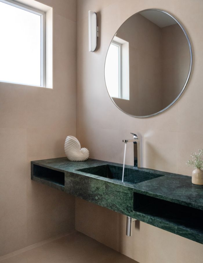 The emerald marble counter is a foil to the tranquil beige; Photographs by suryan//dang
