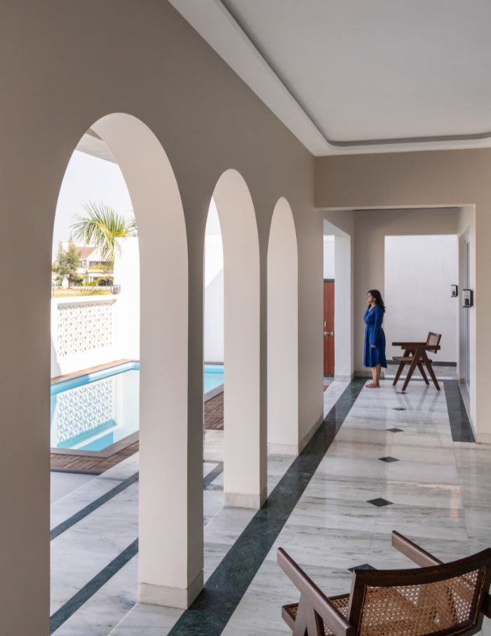 Focused on evoking a sense of tranquillity and peace, the design incorporates Wabi-Sabi elements – white walls and furnishings, warm textures and lots of greens. The use of materials such as terracotta and vernacular Indian stones adds an earthy, rustic touch to the space. Steering away from gilded glamour, the space radiates opulence in minimalism.