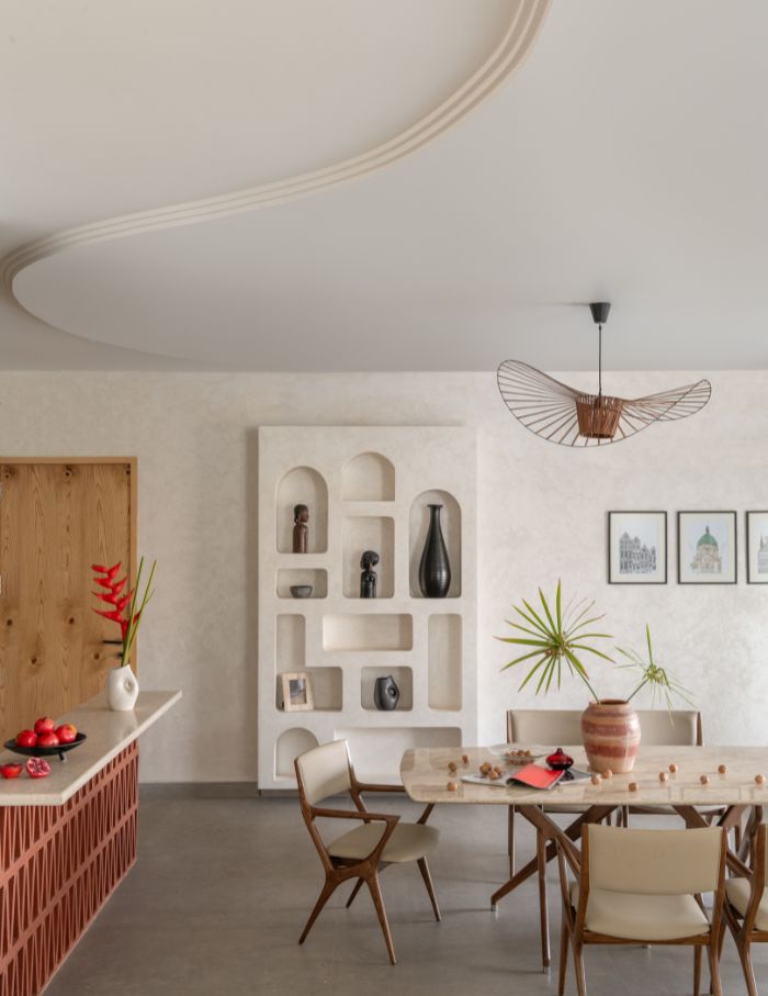 From the conventional arched doors and windows to the abstract circular fenestrations – from the curvilinear false ceiling of the living room to the art deco elements at the bar – the home showcases unique incorporation of curves, enhancing the warm and tranquil ambience of the space.