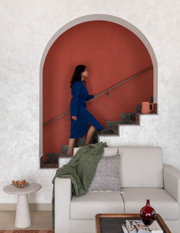 The staircase leading to the upper floor features a striking terracotta colour finish on the handrail. The space is flooded with natural light filtering through the glass bricks fixed into the fenestration.