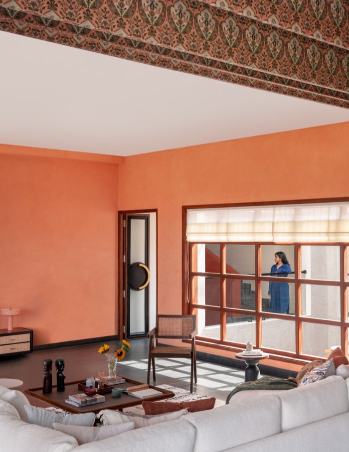 The lounge features Sabyasachi Wall Coverings on ceiling panels and marmarino texture on walls; Photographs by suryan//dang