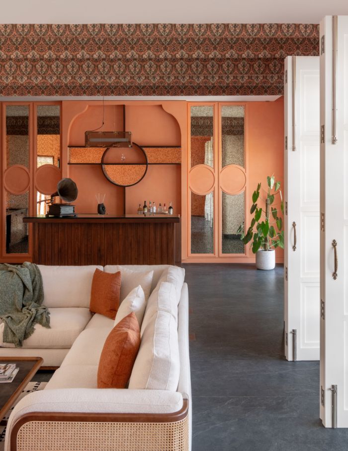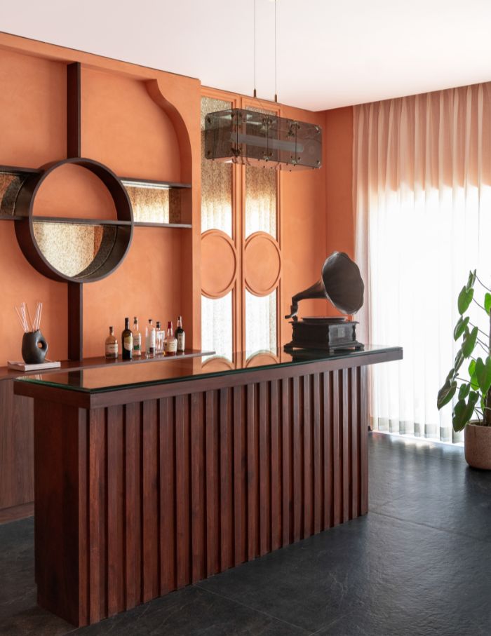 The first-floor lounge offers an inviting space for relaxation, highlighted by a bold tangerine hue. A home theatre provides a cinematic escape while opening up to the balcony that overlooks the lush golf course. With a backdrop featuring art-deco-inspired elements, the bar becomes the focal point of the space.