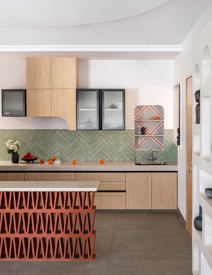 The living room opens to both a courtyard and a serene swimming pool, while a passage with wooden rafters and Indian marble flooring adds an element of heritage. A tree sits in the middle of the courtyard while a stunning light feature hangs from the ceiling. The kitchen features a unique terracotta counter, topped with white marble and a stunning herringbone pattern in green tiles as the backdrop.