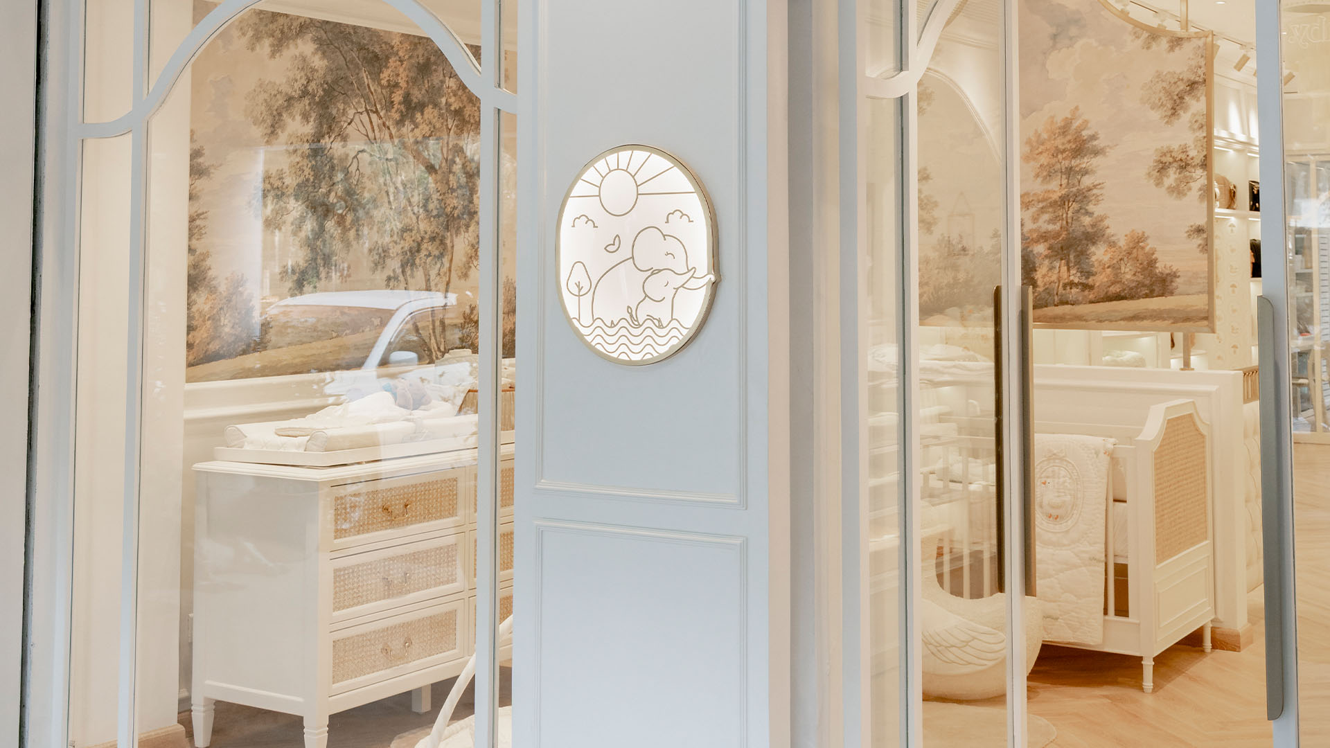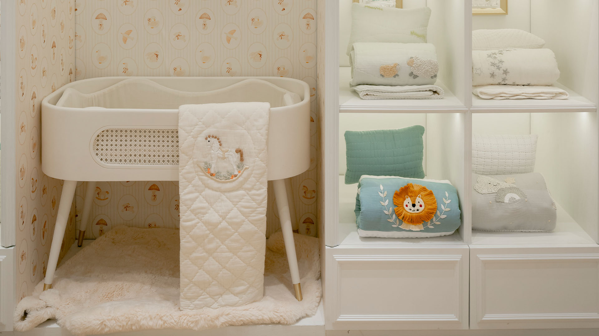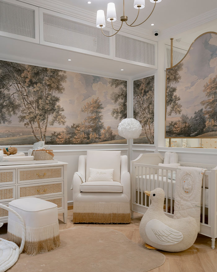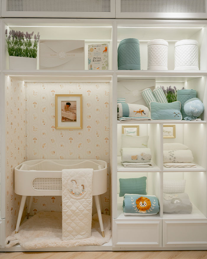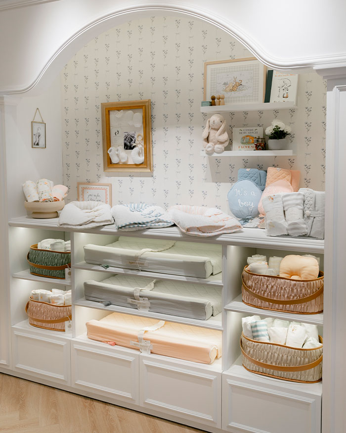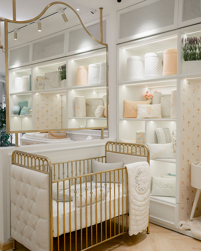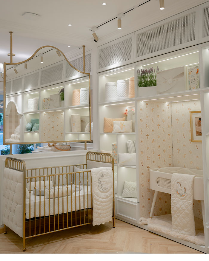 The store became an answer to both these questions. “We wanted to create a space where customers could slow down and really enjoy the process — not just shop, but immerse themselves in the feeling of building their baby’s world,” they affirm. The facade comprises of airy whites and touches of gold, fitted with glass doors accented with delicate arches. Warmly lit and deliberately restrained, the interiors unfold in an assemblage of tiny nursery-like setups, complete with cribs, toys, plushies and armchairs. Designed in collaboration with Elan Wallpapers, the walls bear minimal, bucolic illustrations filled with swaying trees against a cloudy sky. These aesthetic choices were calibrated not only for the parents but for their little ones, too. Baby-proofed to a tee, they’ve utilised low-VOC paints and ensured all furniture within the store bears rounded edges and has been manufactured in their GREENGUARD-certified facilities. These material interventions ensure that the store is safe and non-toxic for toddlers as well — ensuring parents can bring them along as a plus-one if they wish!