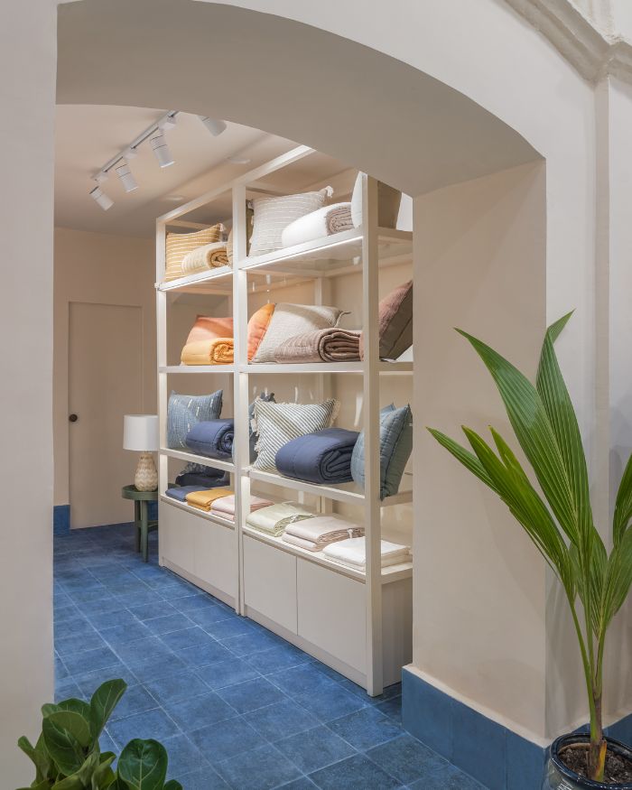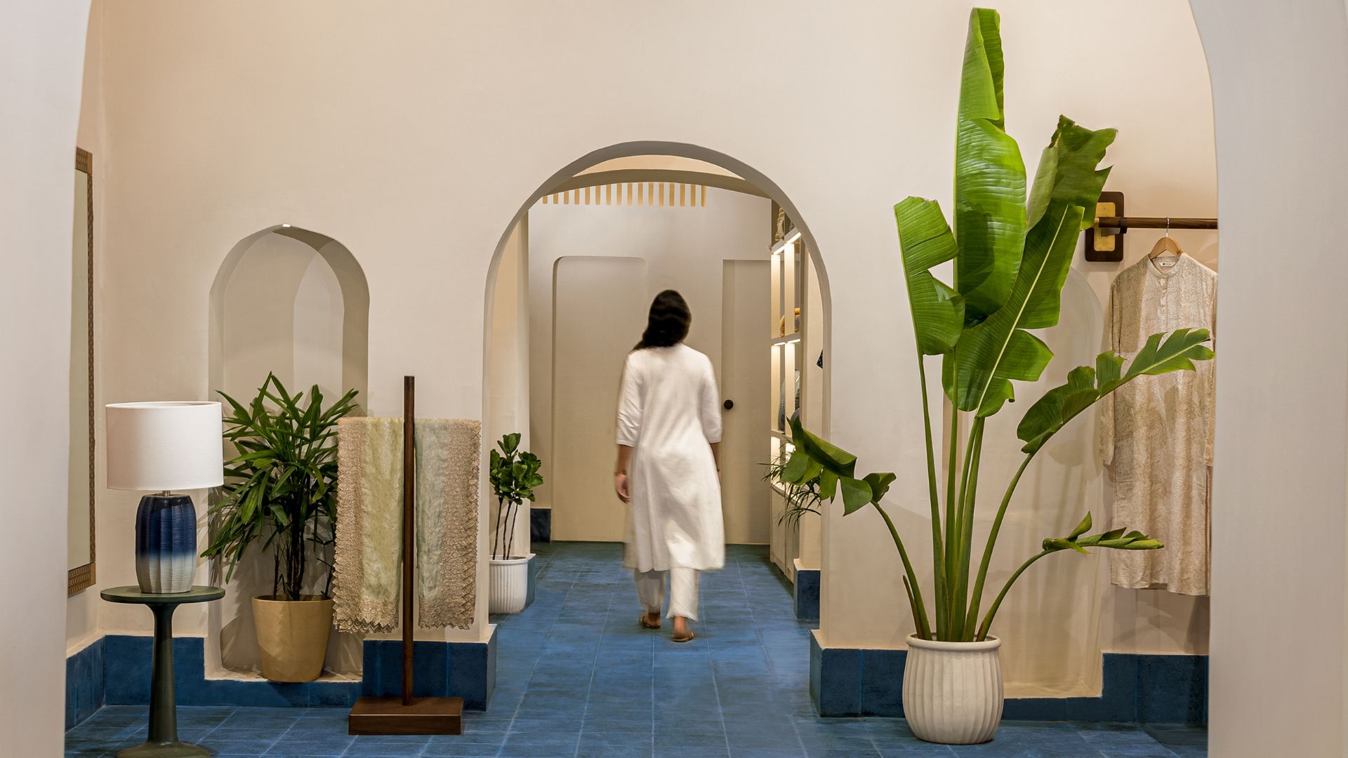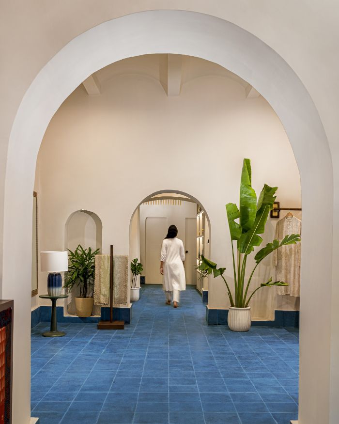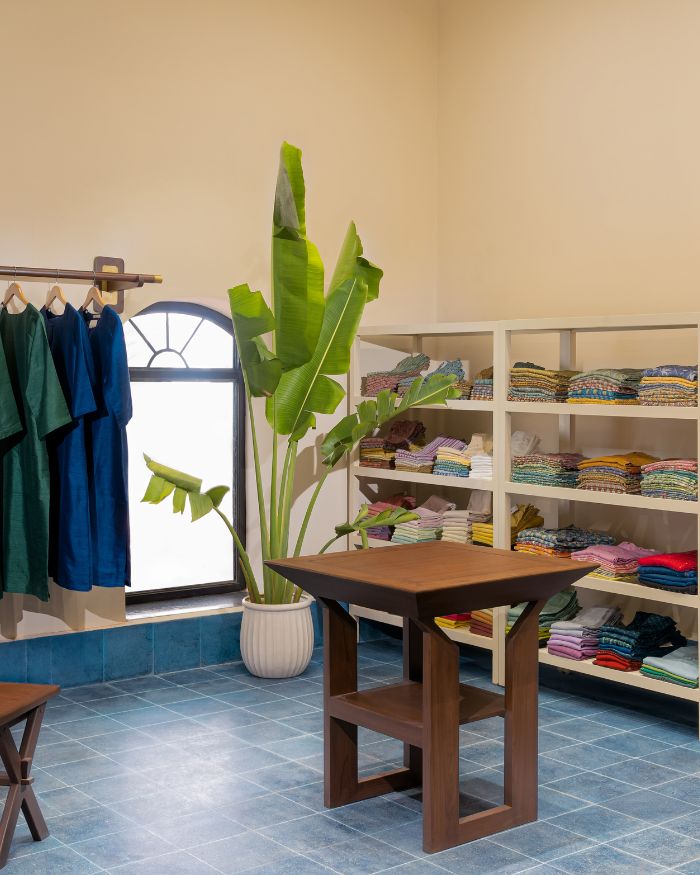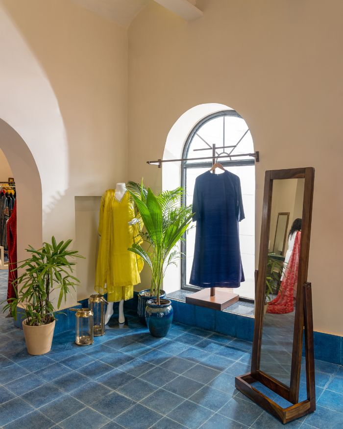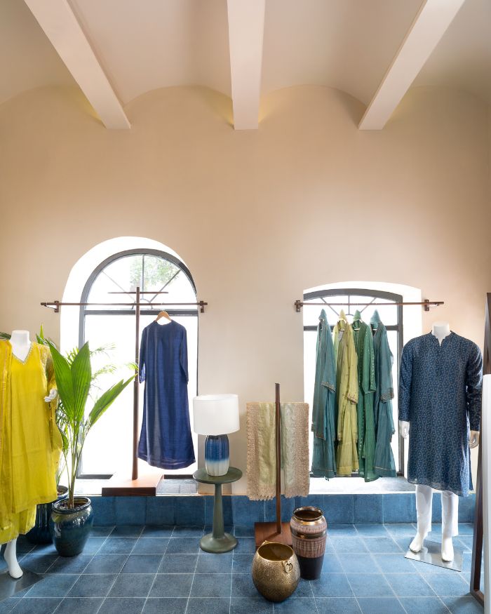 Built in the centre of what was once a printing press, the high-ceiling store promises a paradisal retail-forward experience, suffice with arched windows and blue terrazzo flooring. “Situated within a 100-year-old refurbished printing press, the store is more than just a retail space. It is a tribute to history, architecture and craftsmanship,” says Darshali.