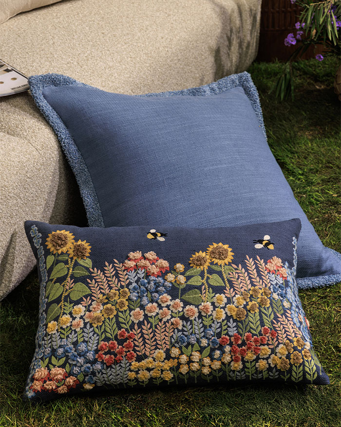 Across living areas, decorative cushions add layers of storytelling and character. Designs like Garden Spray, Canopy, Frondage, Garden Bug and Robin’s Nest draw from meadow florals, foliage and the delicate presence of garden creatures. Executed through crewel embroidery, adda work, towelling embroidery and loop techniques, they introduce richness and artisanal detail. Balancing these organic expressions are more structured, geometric designs such as Bold Blocks, Brick Cane and Checkered — offering a harmonious interplay between fluidity and form.