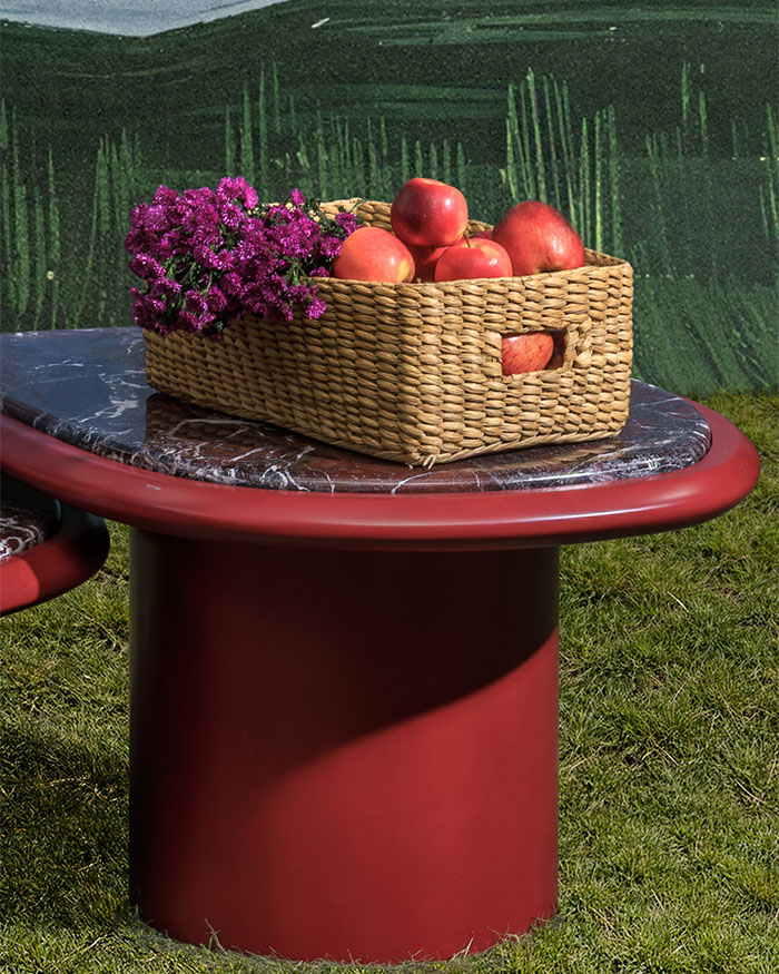 Standout pieces include the fluted GERARD coffee table in toasted walnut, the striking red-lacquered CRESCENT nesting tables topped with Red Levante stone and the carved black SAVAANA side table inspired by African sculptural forms. The ZEN side table, with its delicate cast-glass top, offers a lighter, more ethereal counterpoint. Completing the setting is the HALO armchair, whose curved silhouette and plush upholstery invite comfort and ease, creating a space where the narrative of Spring Fables can fully unfold.