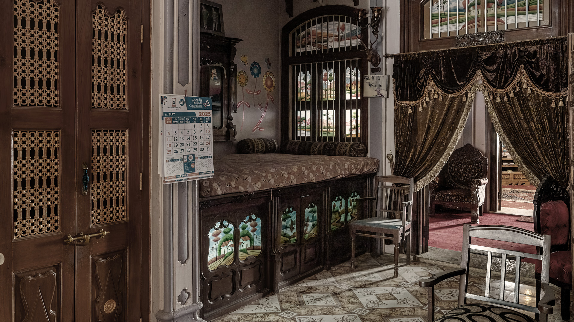 These were homes with kitchens, prayer rooms, deep courtyards, stitched textile traditions and domestic ceremonial spaces structured around daily life. One striking example of intentional domestic design is the pyaayu, an elevated ornate pedestal built solely to hold a water lota. As one resident explained, pointing to the pedestal: “Kimmat paani ki hai.” The value lies in the water it protects, and not necessarily the object that holds the water. Today, most of these houses are padlocked and uninhabited, shaped by migration, changing trade routes and shifting aspirations. Many of the Bohra mansions stand locked, their families long dispersed. The houses have hardly been restored or repurposed, and that makes Siddhpur important. It is one of the few places where we can see domestic maximalism exactly as time has left it. Weathered walls, faded paintwork, broken floors and exposed woodwork show how materials age, craftsmanship survives, and how architecture records migration, a document of social history. It is valuable because it is untouched.