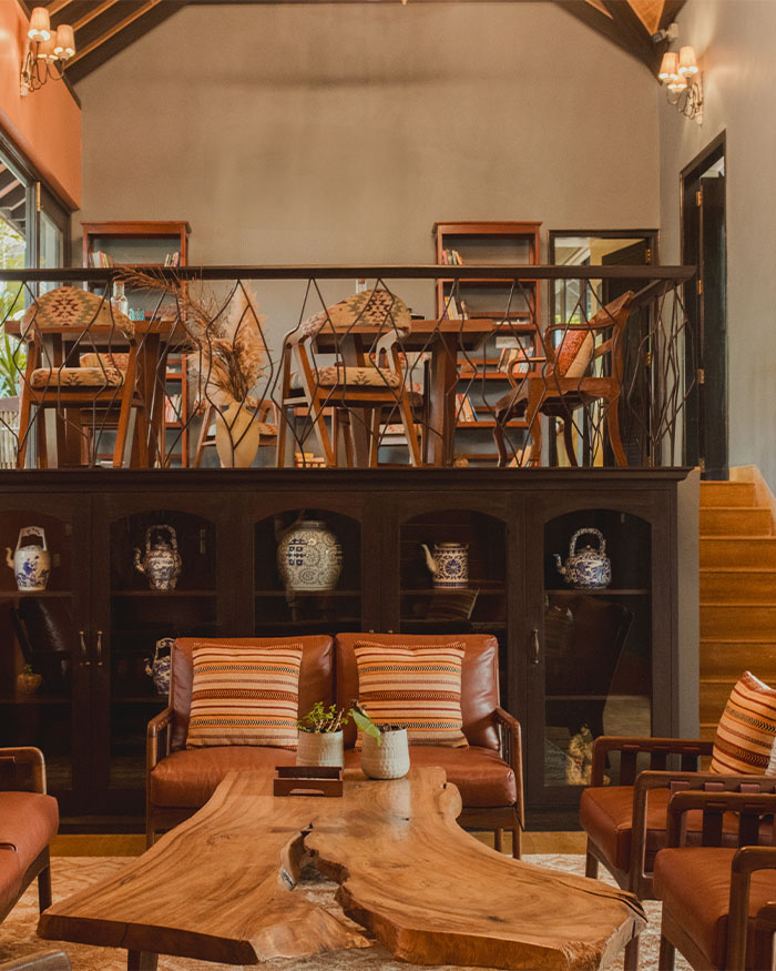 To accommodate Saligao’s sloping terrain, the property sprawls across multiple levels. The entrance sits in the middle, leading the way to a cosy lounge with couches and armchairs for food-coma afflicted patients such as myself. A mezzanine perches above the lounge, featuring two dining tables perfect for couples who prefer privacy — or for solo travellers with only a book as a plus one. As someone who fits in the latter category, the sight of two tall bookshelves here against the wall gives me great solace.