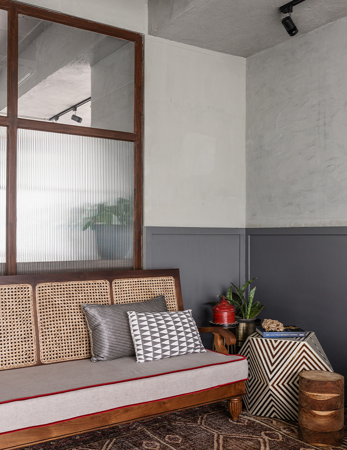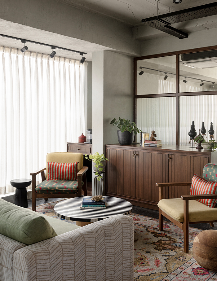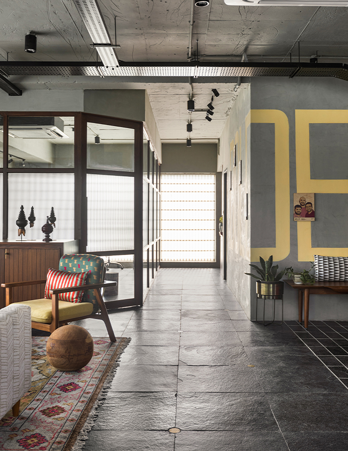 With the conference room on one side and the managing director’s cabin on the other, the lounge area balances the slate with its fun temperament and even cosier seating – wooden chairs outfield with vivid colours and patterns.
