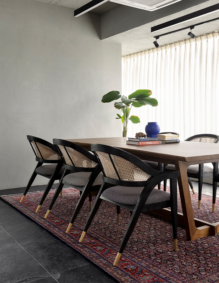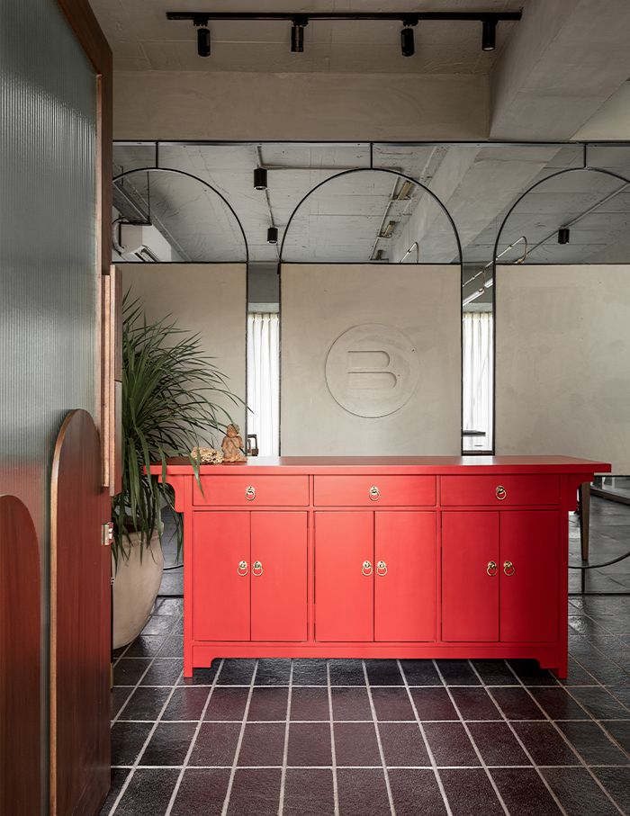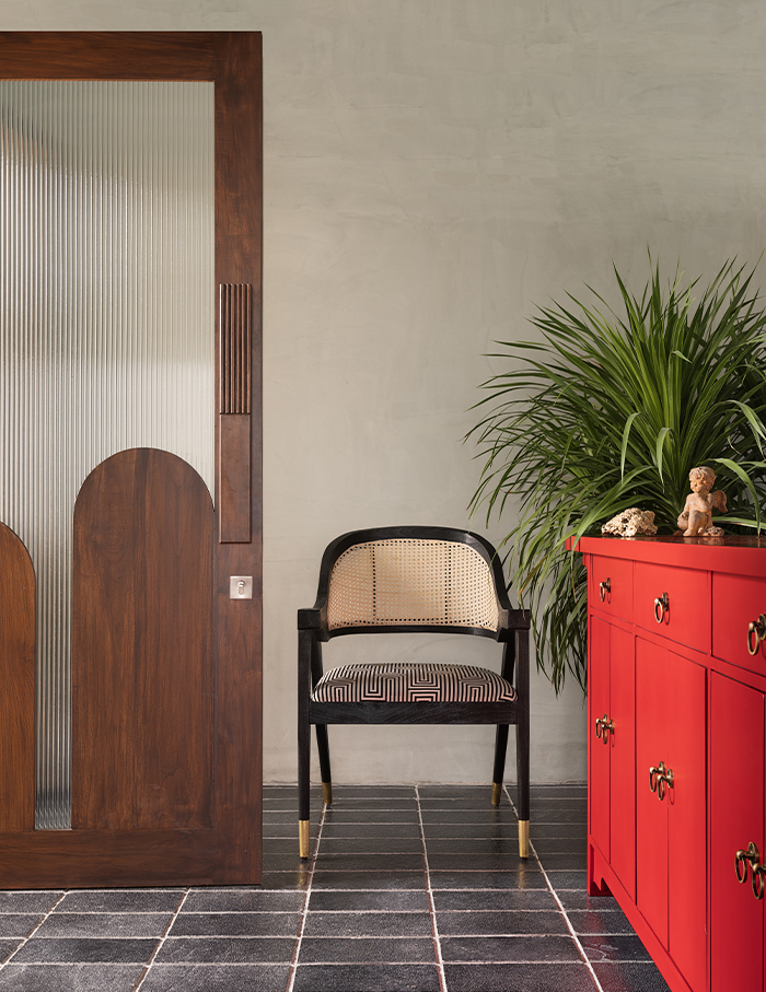 A subtle palette defines the background against which these vivaciously designed furniture and furnishings are placed. The blood-red entrance foyer takes one right into this design choice, with a crimson console placed against the grey. On the other side of the foyer is a dynamic open space befitted with rattan chairs and a darker grey work table for the employees.