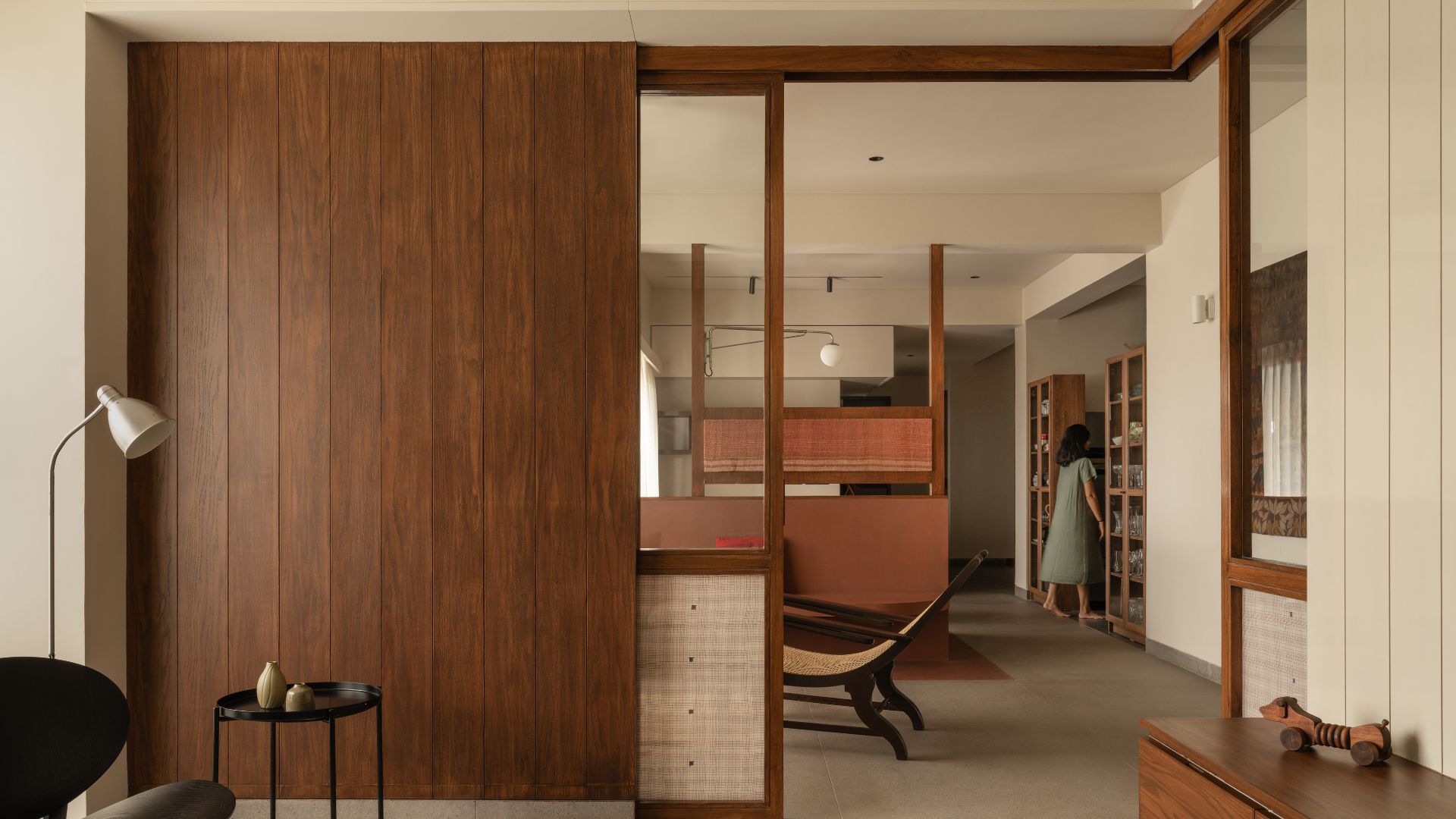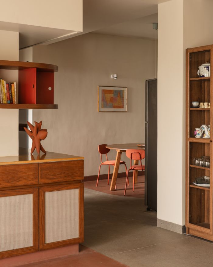 The vision behind the design comes from Compartment S4, the multi-city practice co-founded by Aman Amin, Manuni Patel, Monik Shah, Kishan Shah, Vedanti Agarwal, Krishna Parikh and Nishita Parmar as a travelling design collective. The project’s name, Pravaah, carries a symbolic meaning. Translating to ‘flow’ in Sanskrit, it is a nod to the continuous progression of the abode and the inhabitants as they transition into a more compact, functional home.