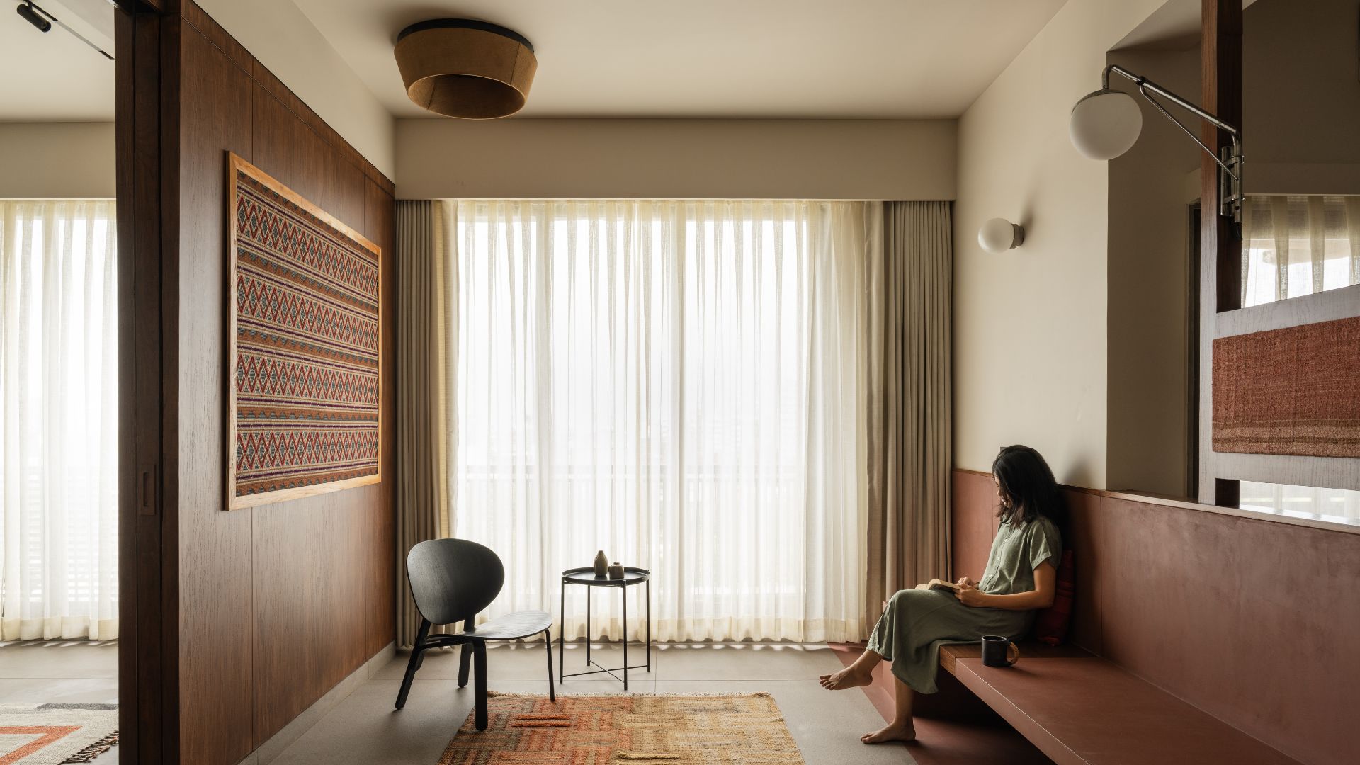 In the lounge, stillness and natural light create moments of pause while umber accents serve as the ideal, warm backdrop; Photography by Harsheen Mengar
