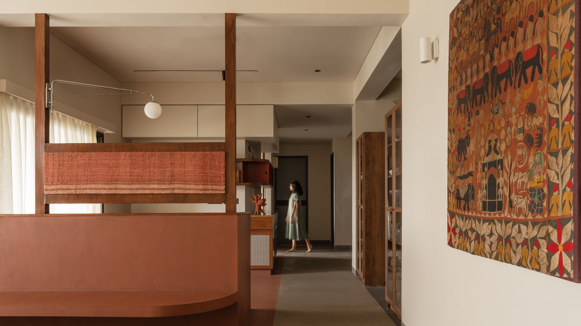 Colour and pattern debut across the abode through textiles, while red micro-concrete earmarks zones as one moves through the home; Photography by Harsheen Mengar