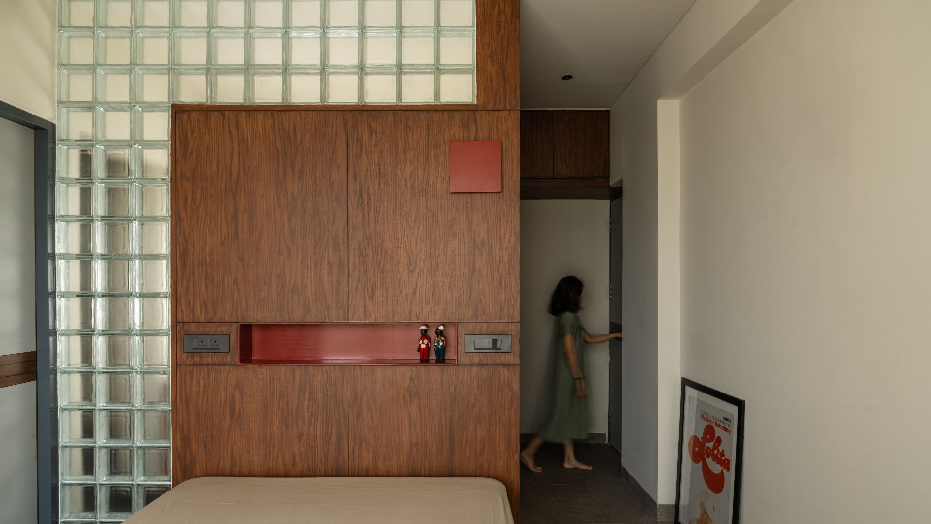 Wood’s solidity meets the lightness of glass bricks in one of the bedrooms, allowing light to filter deeper within; Photography by Harsheen Mengar