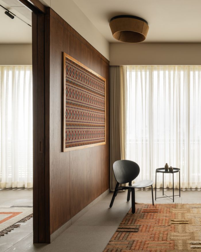 The couple’s cherished trove of Indian textiles does not rest stowed away in vitrines or in opaque almaaris. It seeps into architectural inserts like tactile inheritance, repurposed into partition systems, the team illustrates, “Rigid walls have been swapped with partial dividers, sliding doors, and cut-outs to mark transitions. The use of fabrics embeds meaning into the structure instead of treating it as decoration.”