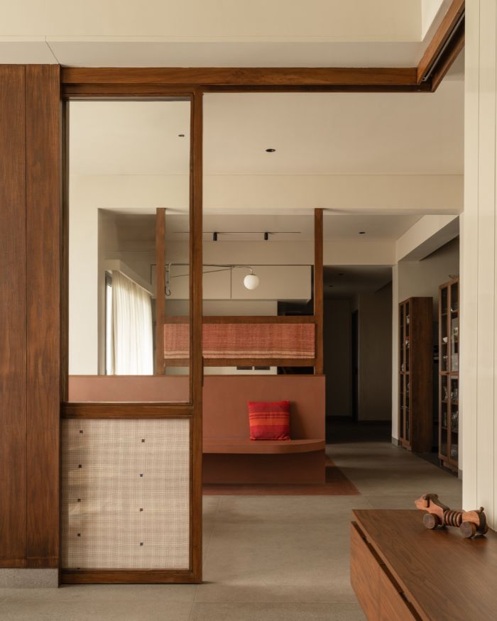 The couple’s cherished trove of Indian textiles does not rest stowed away in vitrines or in opaque almaaris. It seeps into architectural inserts like tactile inheritance, repurposed into partition systems, the team illustrates, “Rigid walls have been swapped with partial dividers, sliding doors, and cut-outs to mark transitions. The use of fabrics embeds meaning into the structure instead of treating it as decoration.”
