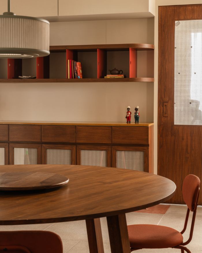 A peek at the dining space, set past the home’s central study. The sculpture is a Vyom Mehta creation, and the fabric in the cabinet shutters comes from the client’s collection; Photography by Harsheen Mengar