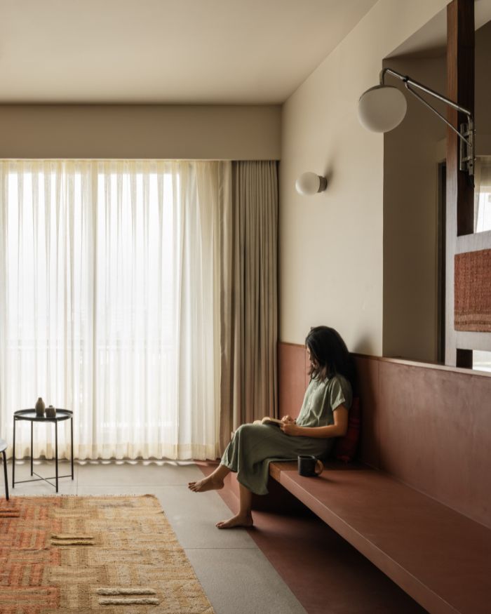 In the lounge, stillness and natural light create moments of pause while umber accents serve as the ideal, warm backdrop; Photography by Harsheen Mengar