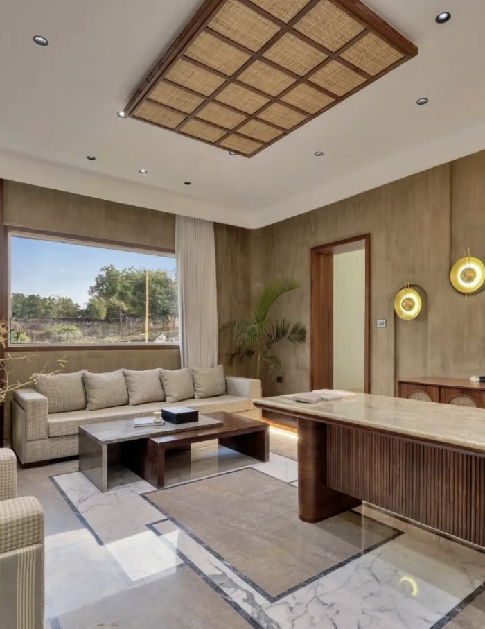 Housed in Udaipur, the Office for Dazzle Marble is designed to withstand the test of time. An earthy colour palette unfolds through a visual play of textures, realised through an abundance of wood, cane furniture and brass inlay. Sustainability forms the core tenet of the design process, with ethically sourced teak wood and locally sourced marble complemented by lime and cane, boasting a low environmental impact.
