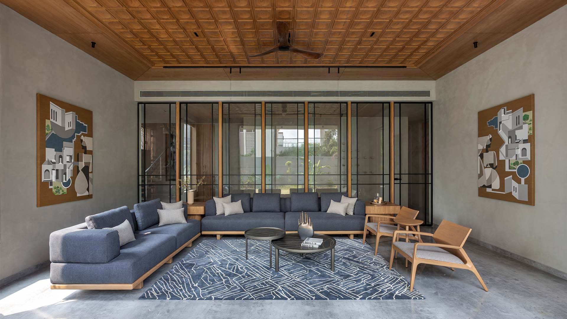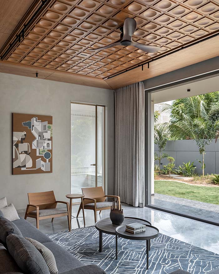 The formal living room dissolves into the garden through large sliding glass doors, the lush exterior drawn into the frame as a fourth wall. The handcrafted teak-coffered ceiling by a+t associates continues overhead, while grey sofas and oak armchairs in houndstooth upholstery from D’Decor gather around a black steel round coffee table on a custom blue graphic carpet from House of Knots. An abstract painting on an ochre ground rests on the lime plaster wall to the left; Photography by Tejas Shah