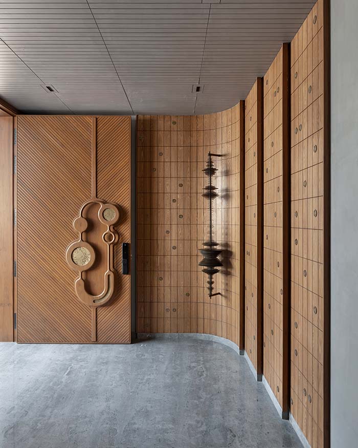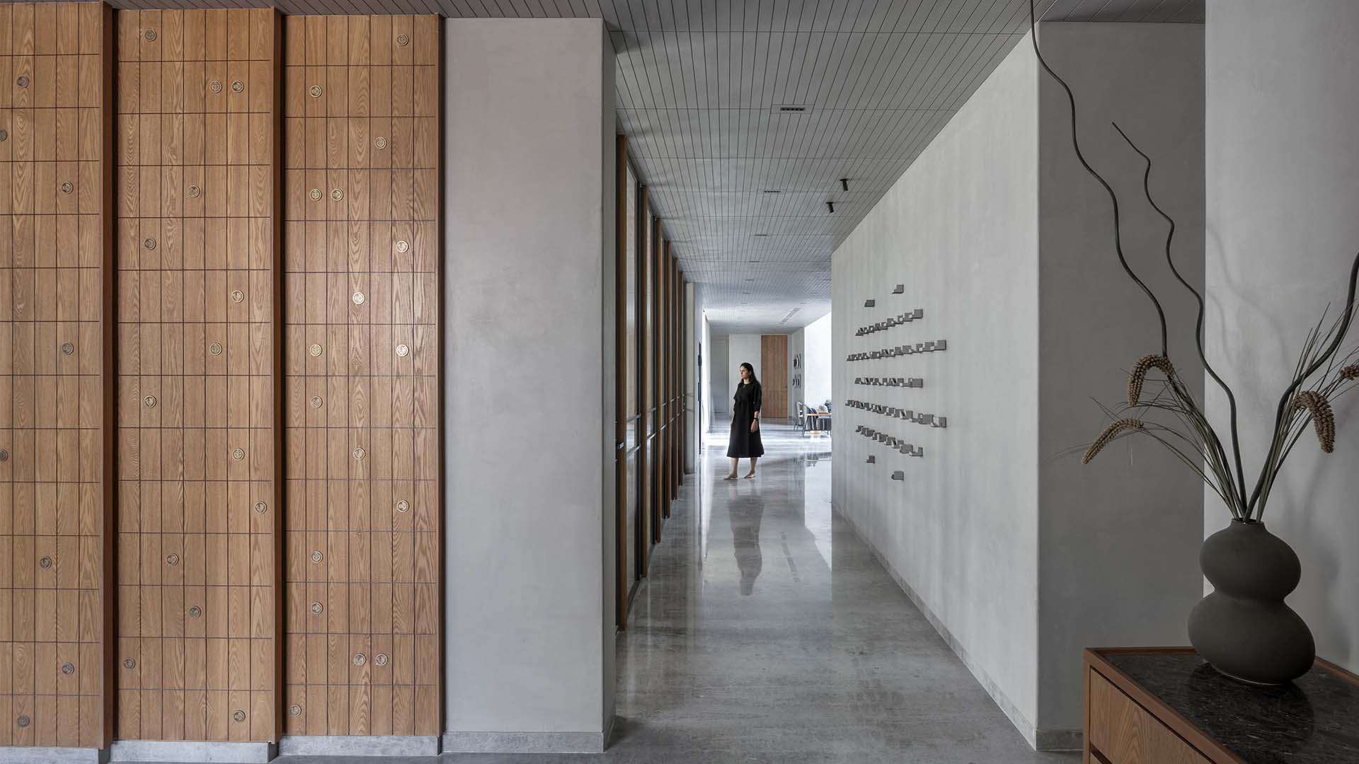 The entrance corridor unfolds as a study in considered contrasts. A grid of oak wood panels with circular brass medallions by a+t associates lines the left wall, while concrete architectural maquette sculptures by Material Immaterial Studio are mounted across the lime plaster opposite, each one a small world unto itself. A rounded stoneware double gourd vase on a low oak sideboard with a black stone top by a+t associates grounds the foreground; Photography by Tejas Shah