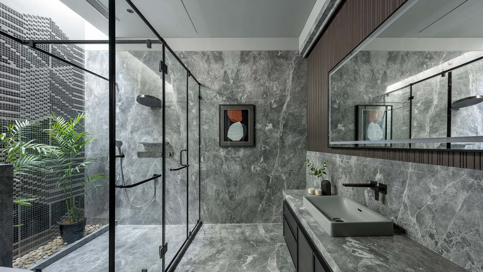 Large format grey marble from CMC sheathes the primary bathroom from wall to floor in one continuous gesture. The glass and black steel enclosed shower enclosure opens onto a private garden courtyard, tropical planting and mosaic stone walls visible beyond the glass. A grey rectangular vessel basin on the marble vanity counter with black matte wall mounted taps by a+t associates occupies the right wall, and a framed abstract artwork by Nidhi Shah is hung inside the shower enclosure; Photography by Tejas Shah