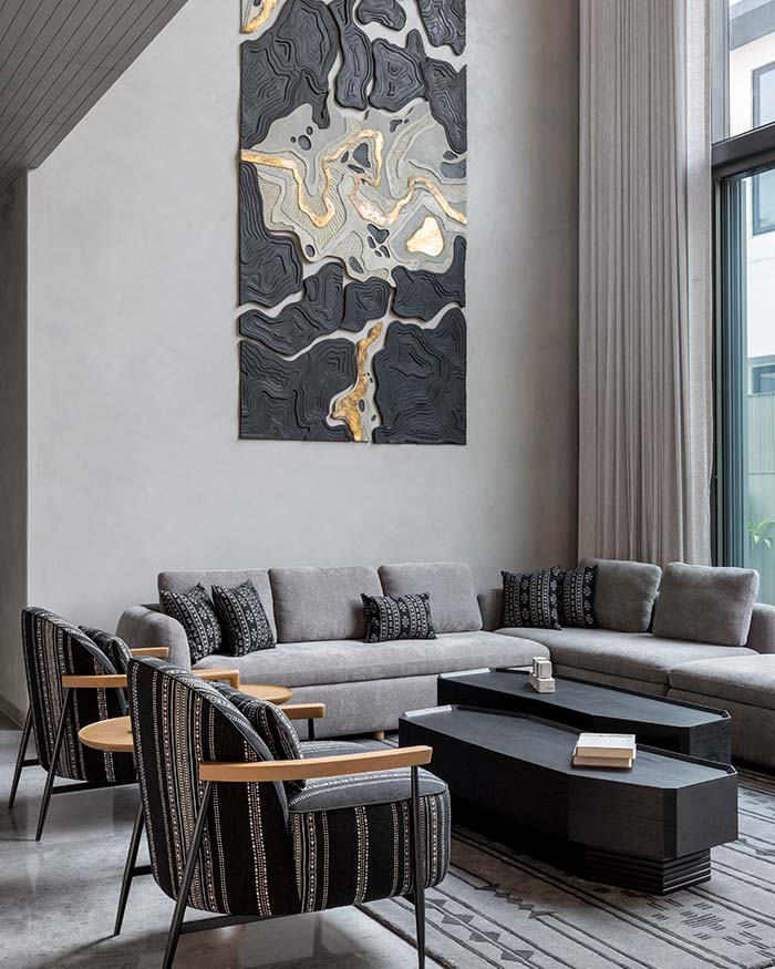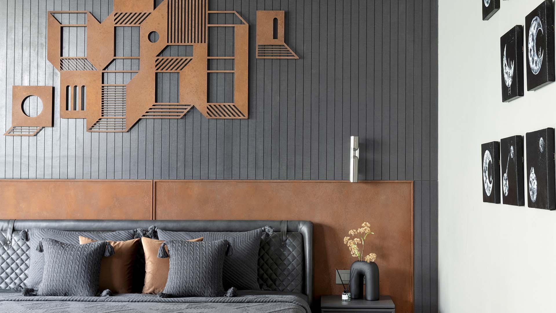 A guest bedroom makes its case for drama through material alone. Charcoal grey fluted stone wall panelling and a corten toned leather upholstered headboard by a+t associates set a decidedly moody tone, while a custom abstract metal wall sculpture in rust and steel tones commands the wall above the bed. Grey quilted linen with tan leather and dark grey cushions from D’Decor offer a considered counterpoint, and six black square artworks by Nidhi Shah are arranged in a quiet grid on the white wall opposite; Photography by Tejas Shah