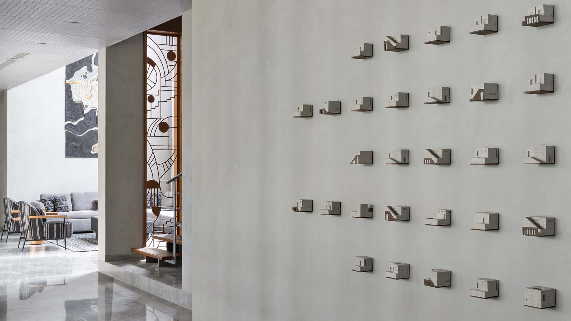 The passage is transformed into a curated moment by a grid of architectural miniatures animating the wall; Photography by Tejas Shah