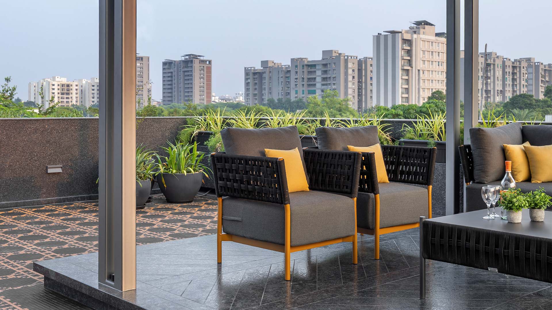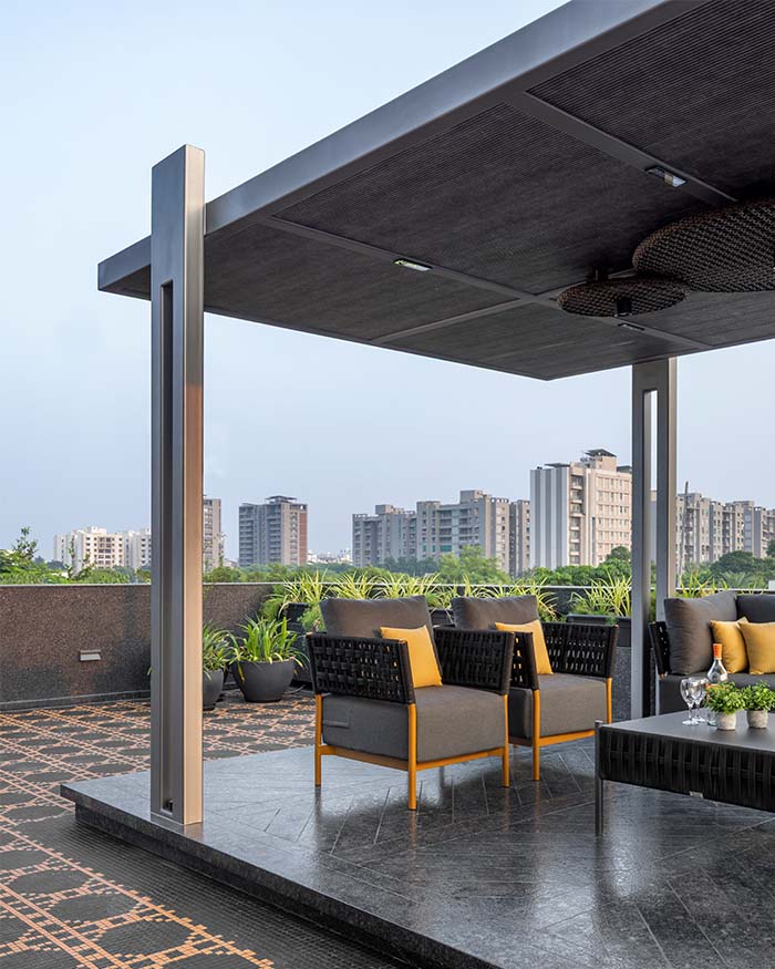 A shaded terrace unfolds as an intimate outdoor lounge; Photography by Tejas Shah